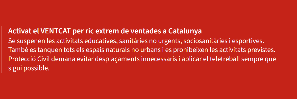 Activat el VENTCAT per ric extrem de ventades a CatalunyaSe suspenen les activitats educatives, sanitàries no urgents, sociosanitàries i esportives. També es tanquen tots els espais naturals no urbans i es prohibeixen les activitats previstes. Protecció Civil demana evitar desplaçaments innecessaris i aplicar el teletreball sempre que sigui possible. Benvolguts i benvolgudes, Ens acaben d’ […]