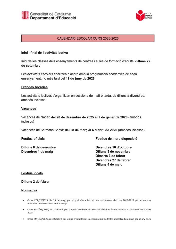 Calendari del curs i horaris generals