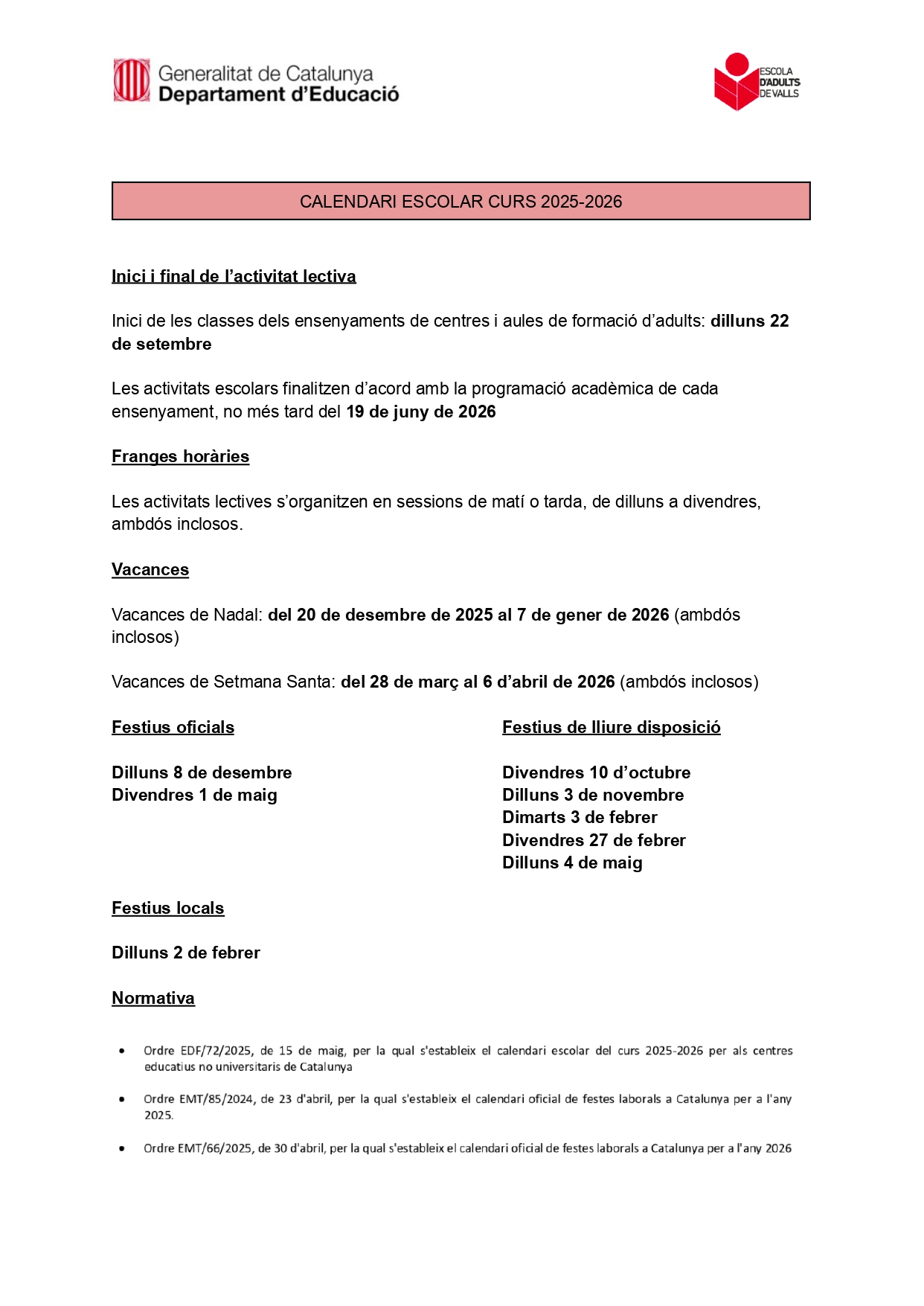 • Calendari del curs i horaris generals
