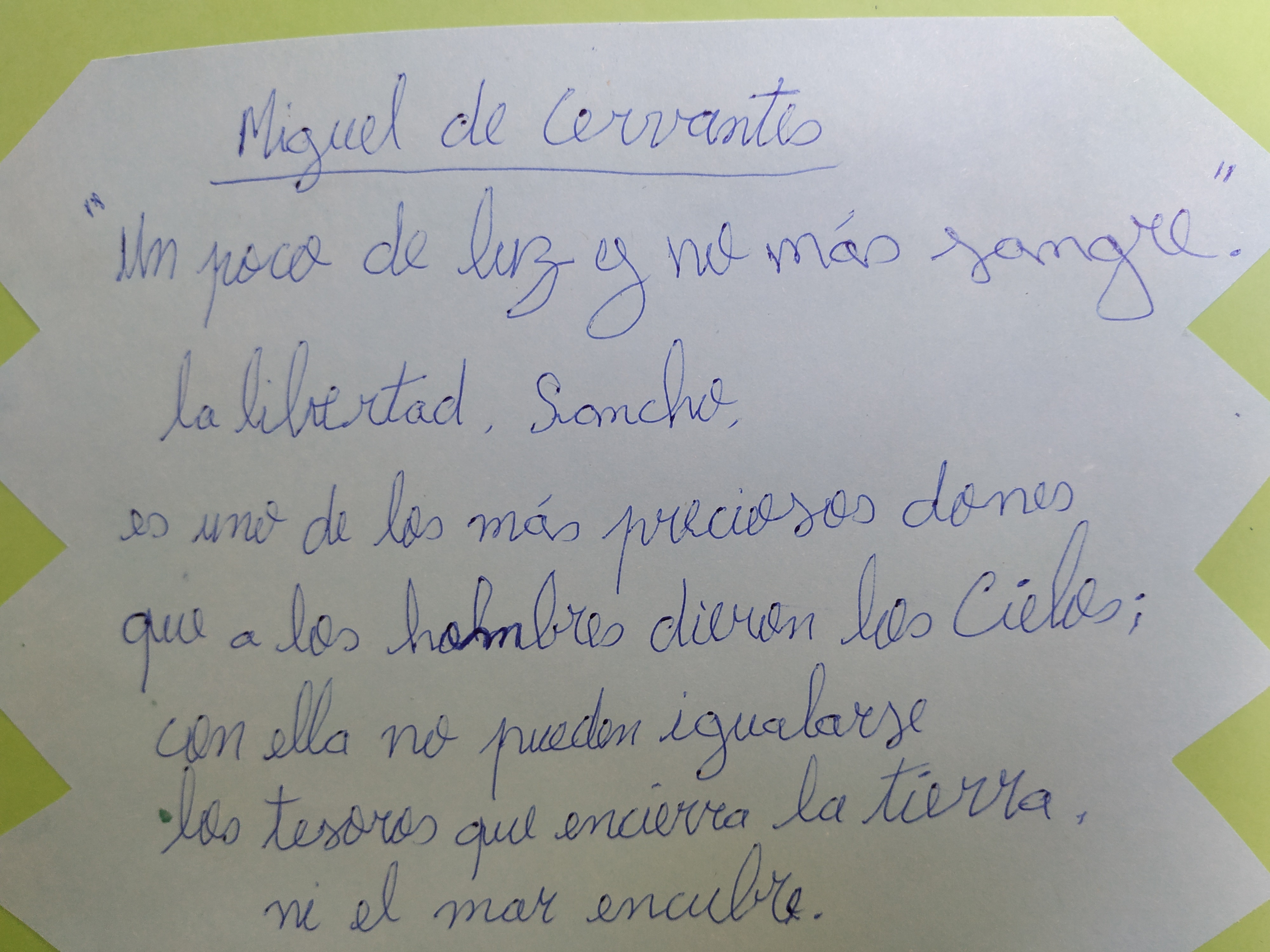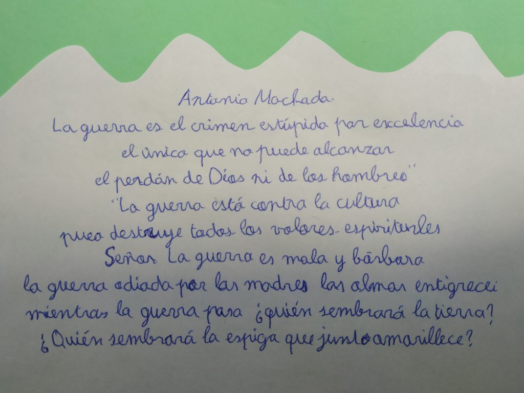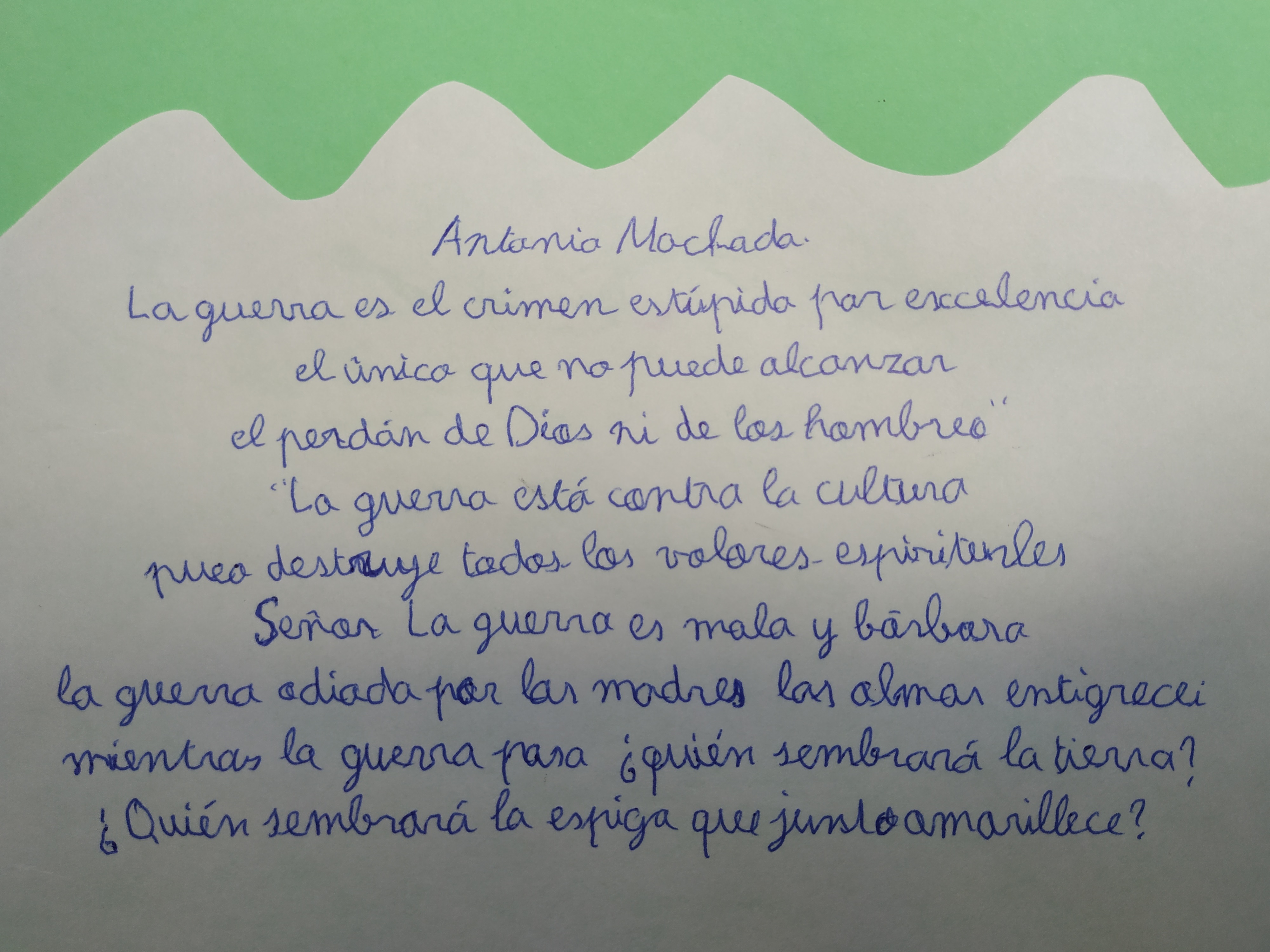 El grup d’instrumental 3 de castellà es va endinsar en la literatura i van llegir uns fragments d’obres escrites en espanyol que descriuen la violència i fan una apologia per la pau. L’alumnat va seleccionar els fragments amb els que més s’identificaven i els van compartir al passadís.