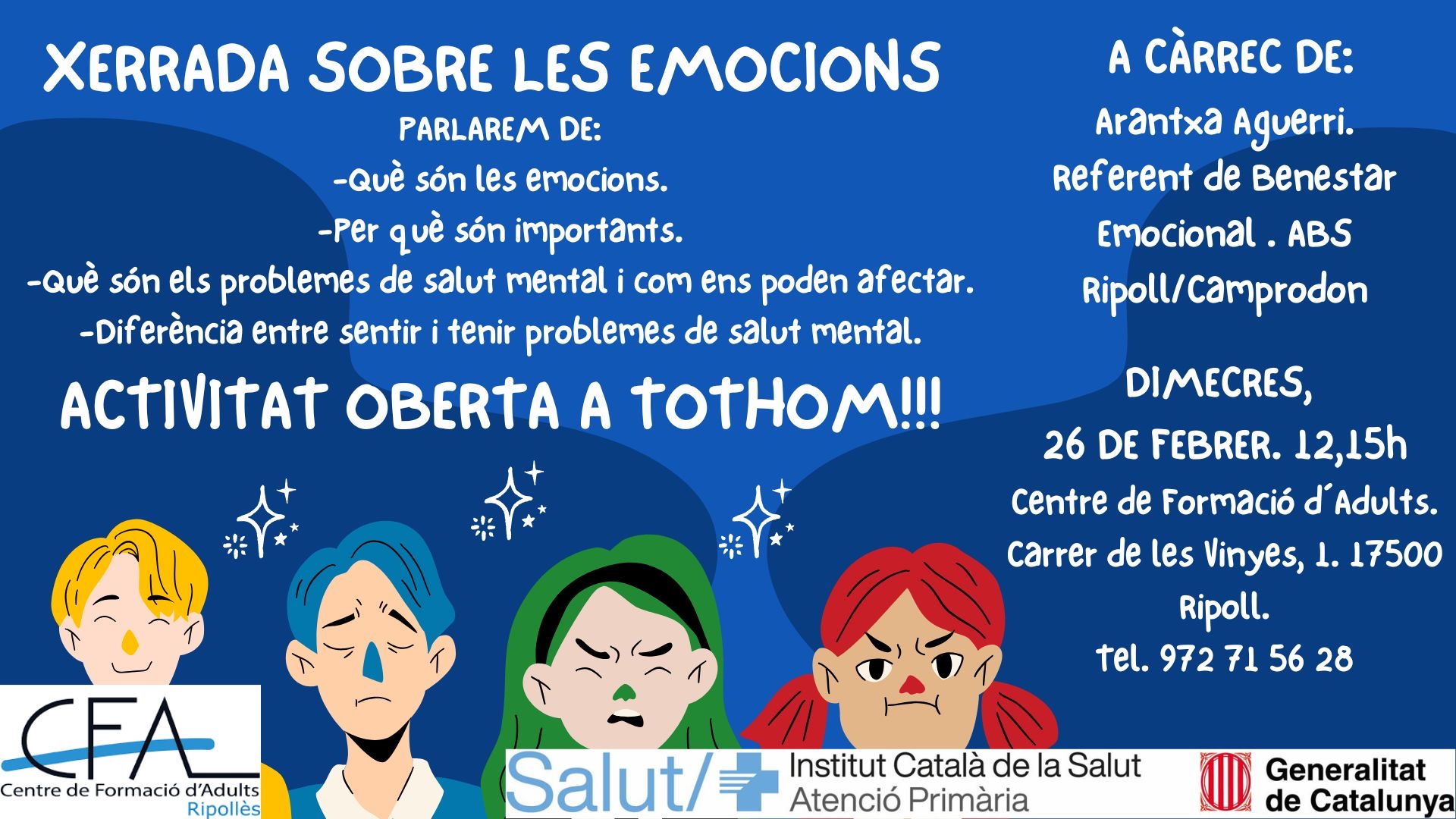 Avui, al Centre de Formació d´Adults del Ripollès, hem dut a terme la xerrada sobre ” LES EMOCIONS. QUÈ SÓN I COM HI CONVIVIM”, a càrrec de l´Arantxa Aguerri, psicòloga i referent de Benestar Emocional de l´ ABS Ripoll- Camprodon.