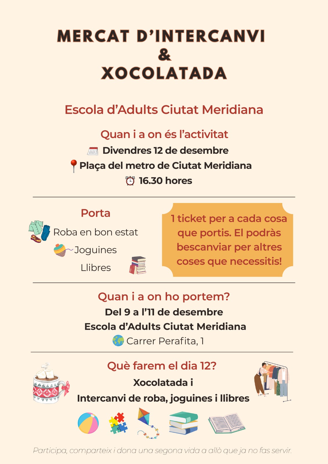 Xocolatada i mercat d’intercanvi Feu un comentari / Per admin / 01/12/2025 / Portada El 12 de desembre la nostra escola celebra al barri de Ciutat Meridiana una xocolatada amb mercat d’intercanvi. Vine i participa.