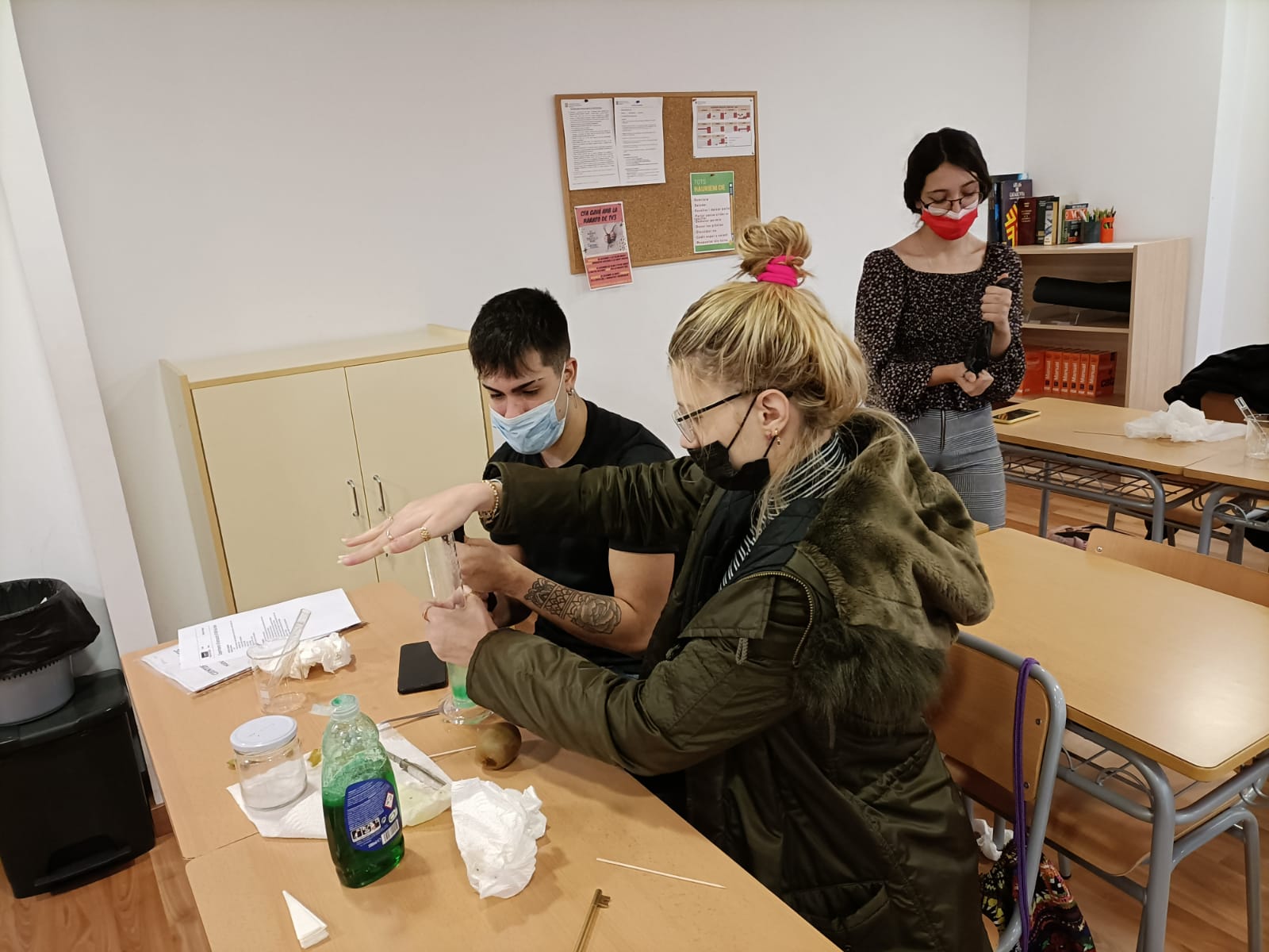L’alumnat del GES 2 ha començat aquests dies el mòdul de Biologia i Geologia. A través de vídeos hem introduït els conceptes de genètica, herència biològica, gen, genotip, fenotip, ADN… i en l’últim dia abans de vacances hem aprofitat per experimentar i apropar-nos al món del laboratori. Amb materials senzills com aigua, sal, sabó i alcohol hem fet una extracció de l’ADN de les cèl·lules d’un kiwi basant-nos en el mètode publicat a recerca en acció.
