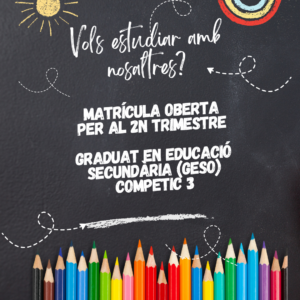 Del 18 al 29 de novembre podeu venir a matricular-vos dels ensenyaments trimestrals: COMPETIC 3 i GESO. Per a fer-ho demaneu cita a consergeria perquè us donin dia i hora per a l’acollida.