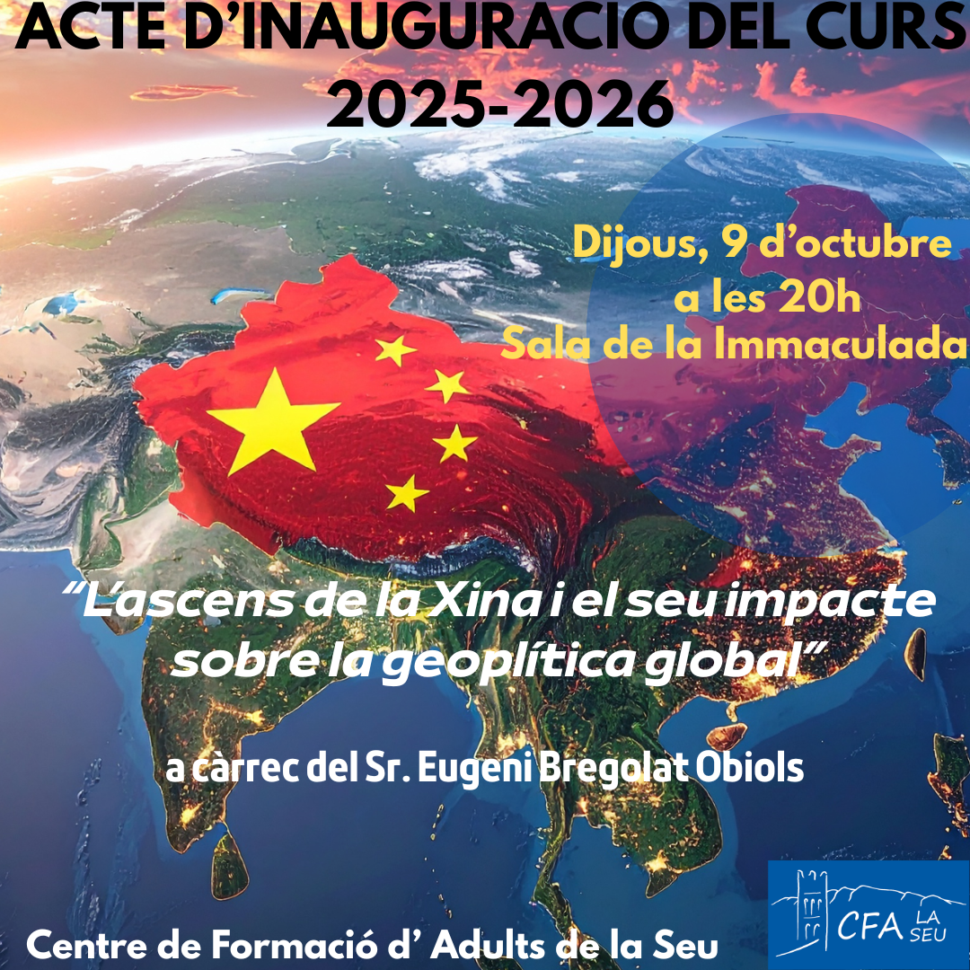 A les vuit del vespre, hem celebrat l’acte d’inauguració del curs escolar, amb la presència de la Sra. regidora, Christina Moreno, la Directora dels SSTT de l’APA, Carlota Valls, i el Sr.Eugeni Bregolat Obiols, amb la lliçó inaugural titulada “L’ascens de la Xina i el seu impacte en la geopolítica global”.