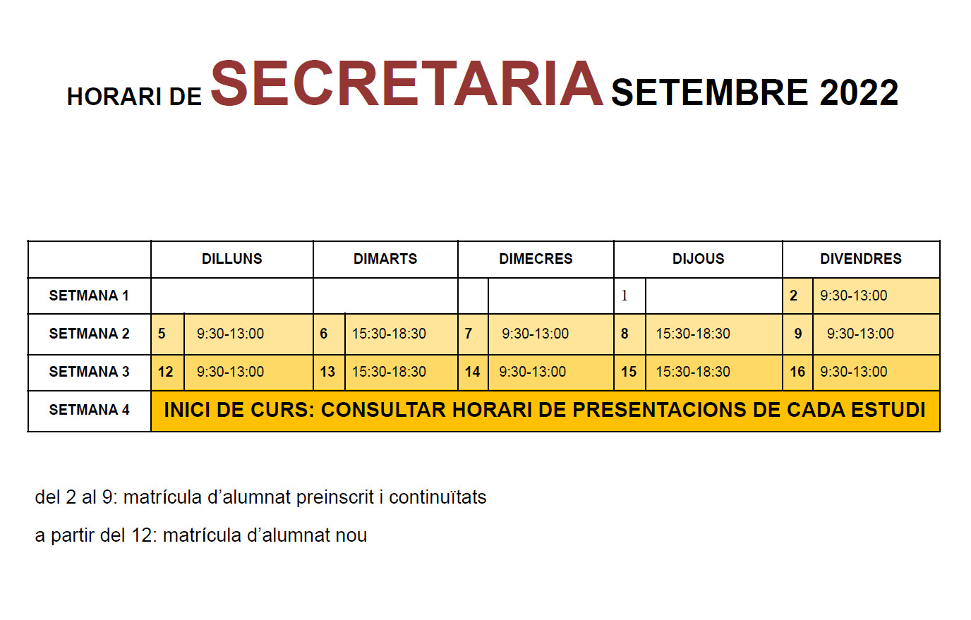 Horari de secretaria. Setembre 2022 admin01/09/22 Aquí teniu els horaris de secretaria per a aquest mes de setembre. Si us vau preinscriure al juny o sou alumnes de continuïtat, us rebrem del 2 al 9 de setembre. Si sou alumnes nous, heu de venir a matricular-vos a partir del dia 12. Us esperem!