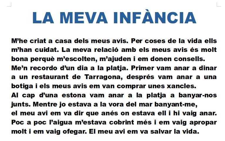 Aquest enfocament permet que cada alumne parteixi d’un punt proper i significatiu, fet que facilita la reflexió i la construcció d’un text coherent. A més, treballem aspectes com l’estructura narrativa, el vocabulari, la cohesió i la correcció lingüística, tot donant espai a la creativitat i a l’expressió personal.