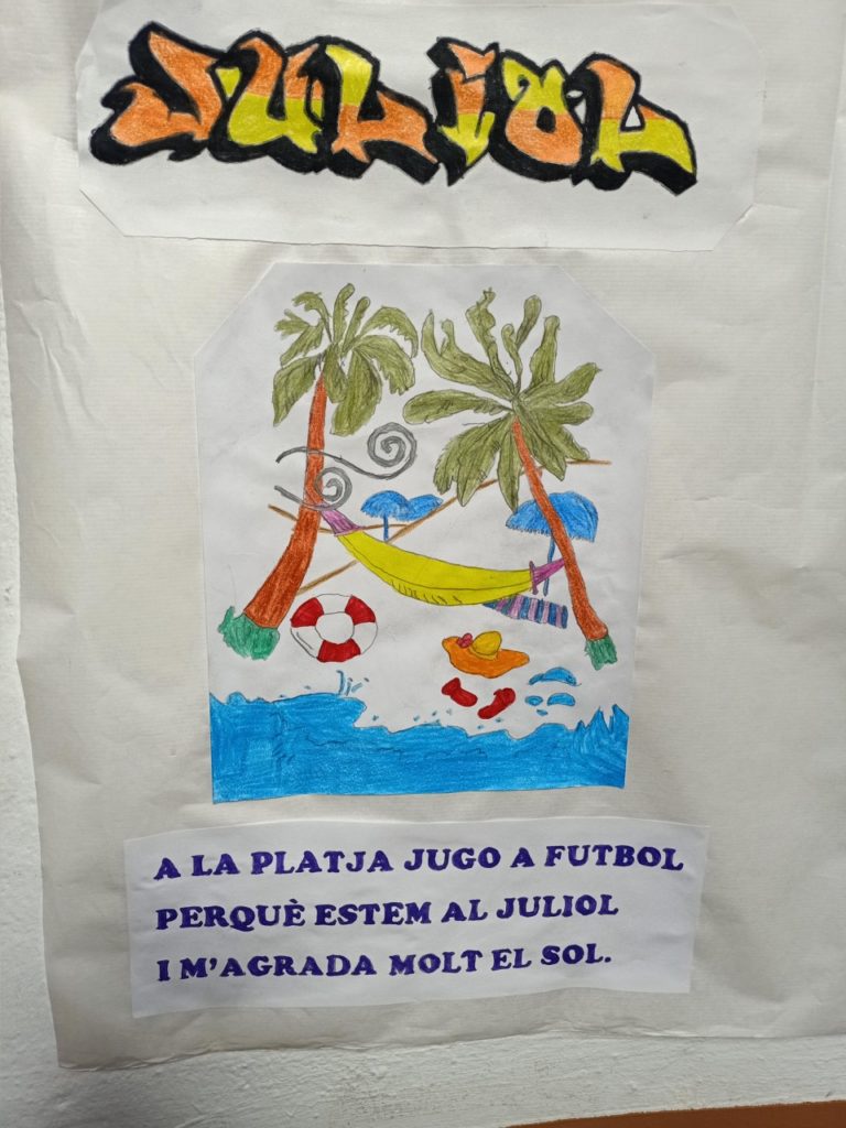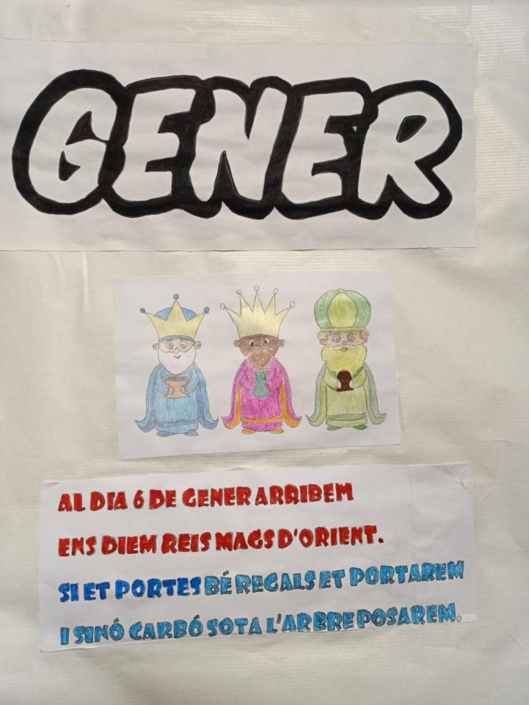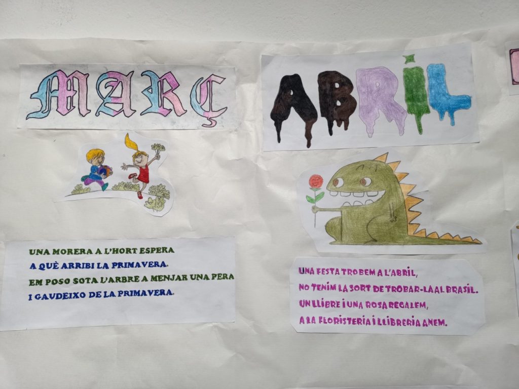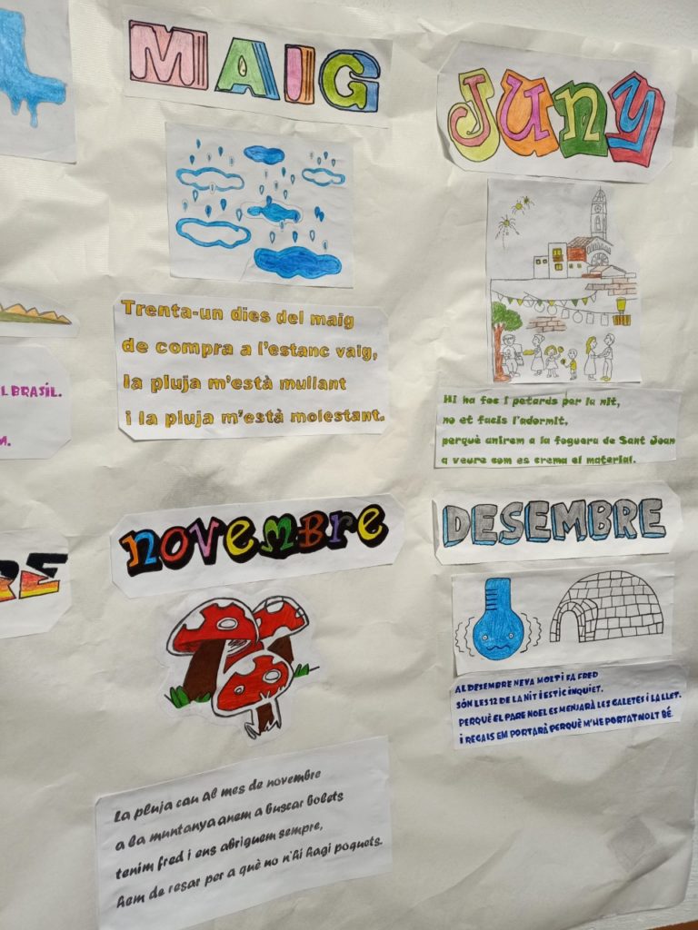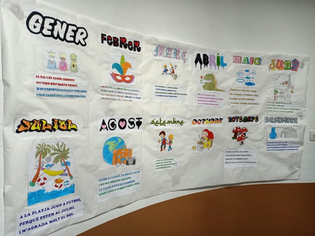 Des de la classe de llengua hem decidit repassar els mesos de l’any, ja que de vegades costen una mica en català. I aprofitant que els hem après, hem realitzat rodolins fent referència a les festivitats de cada mes. I per visualitzar tot el treball realitzat hem volgut plasmar-ho en un mural.