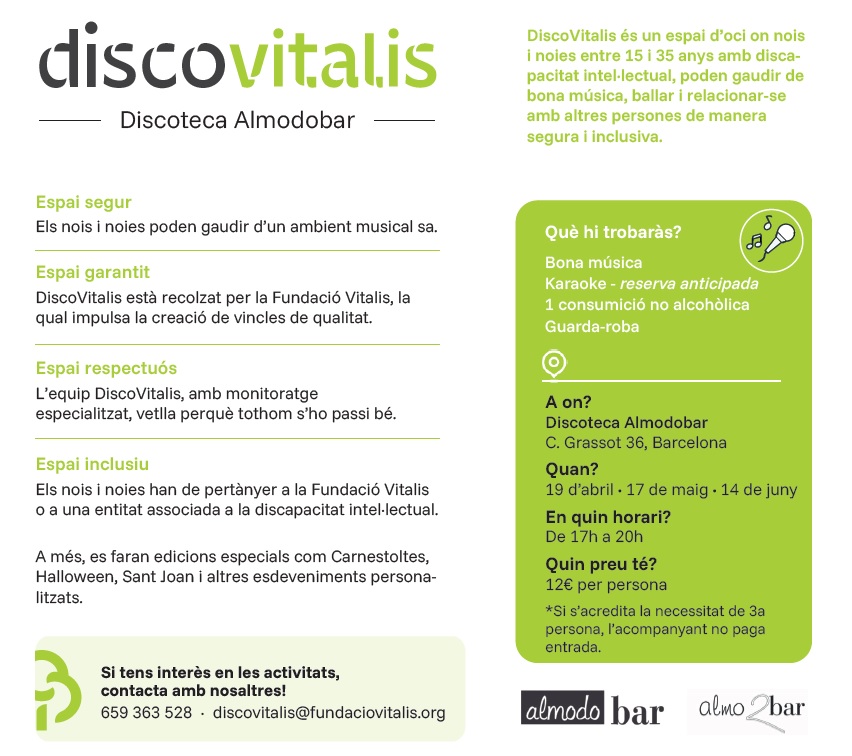 Per aquells nois i noies que vulguin gaudir de bona música, ballar i relacionar-se amb altres persones de manera segura i inclusiva: DiscoVitalis, a la discoteca Almodobar de Barcelona, amb Karaoke.