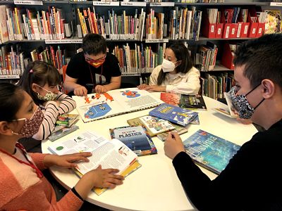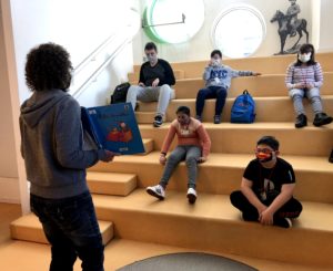Abans d’entrar ens vam posar gel hidroalcohòlic a les mans i un cop a dins asseguts en unes escales molt divertides, ens van explicar les normes per poder estar a la biblioteca.