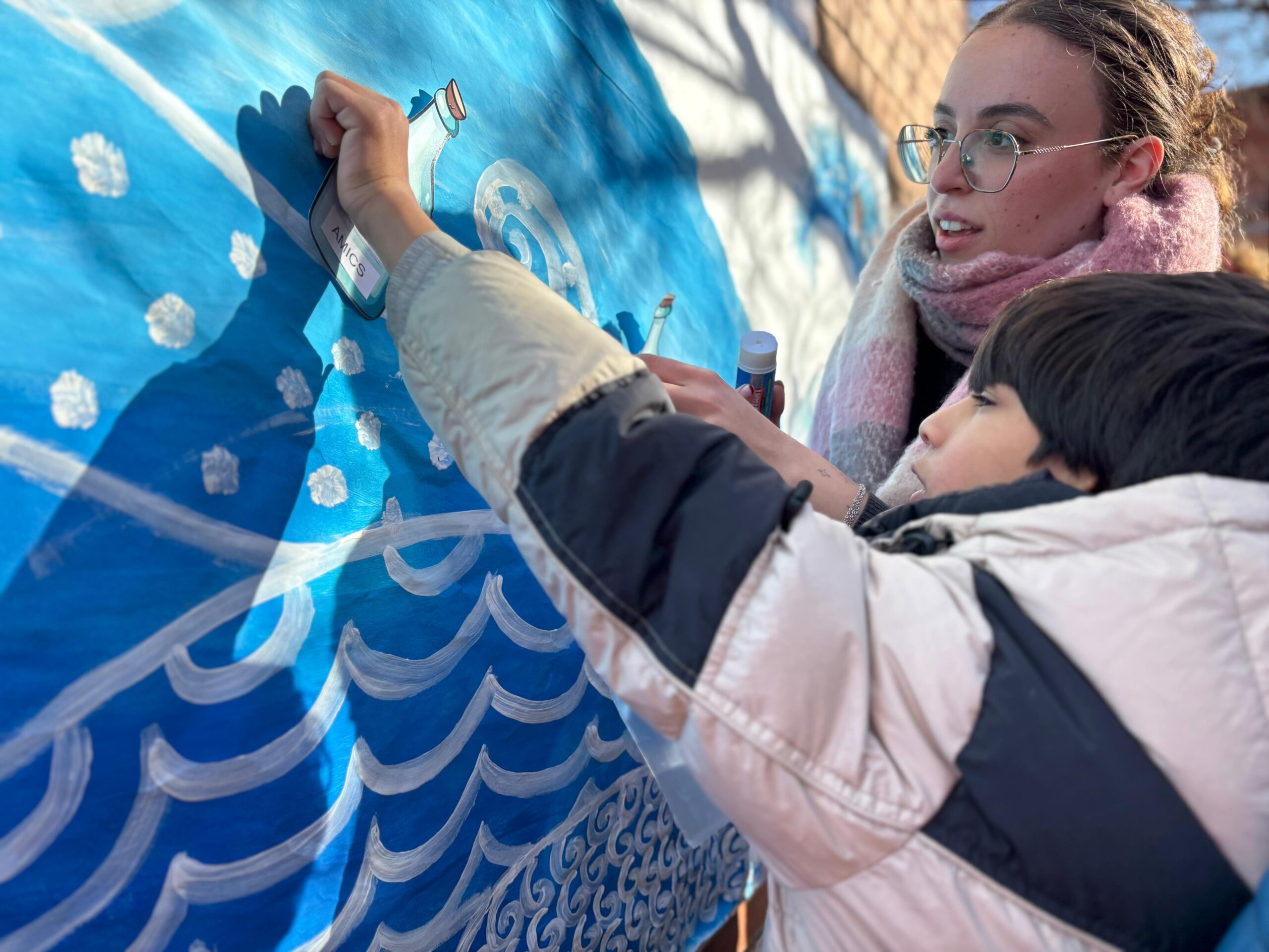 Entre tot l’alumnat vam crear un gran mural del mar, que representava un espai compartit, tranquil i ple d’esperança. Cada nen i nena hi va participar enganxant-hi una ampolla amb un desig per la Pau escrit a dins. Com si fossin missatges llançats al mar, els desitjos expressaven il·lusions, paraules boniques i somnis d’un món millor.