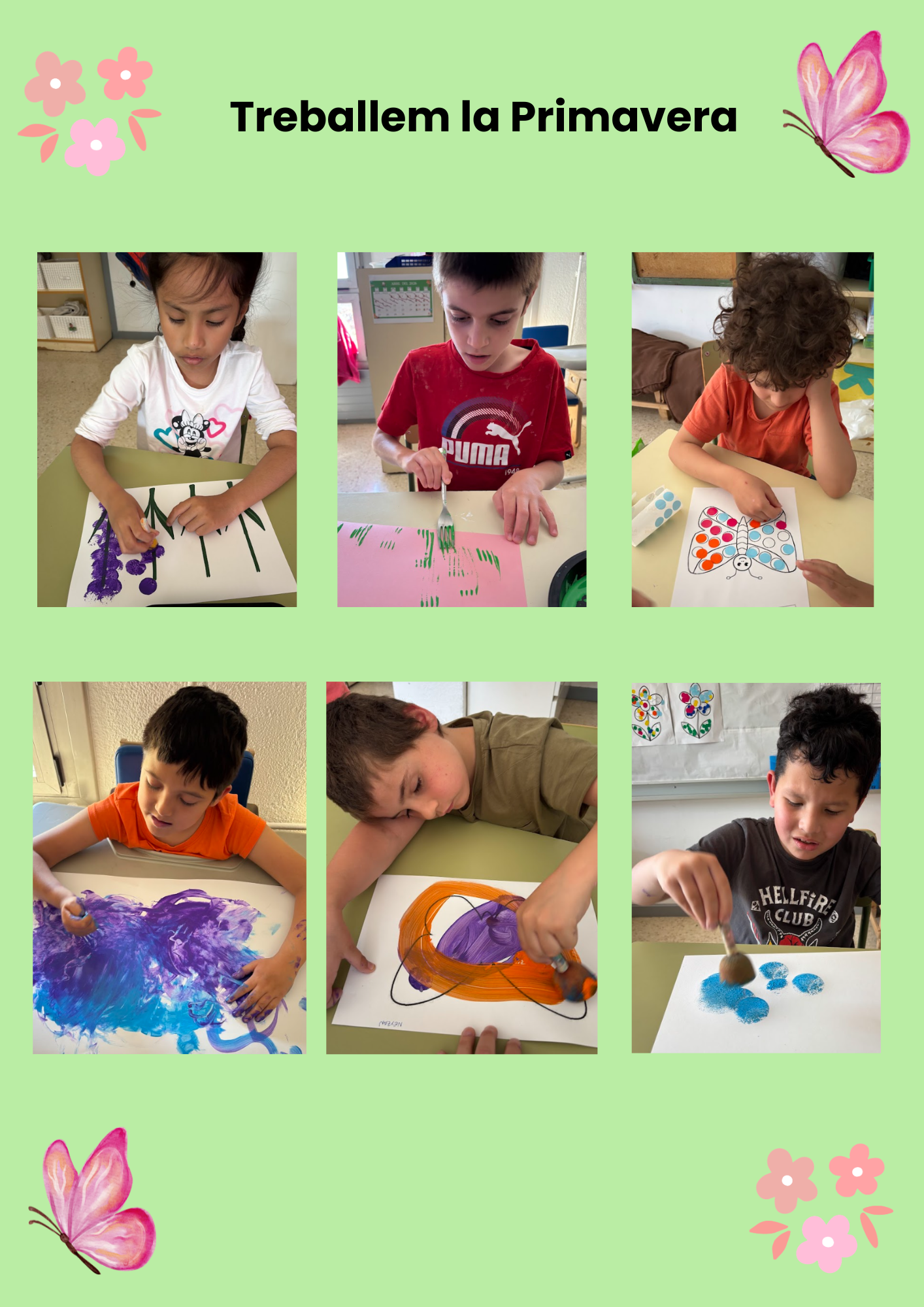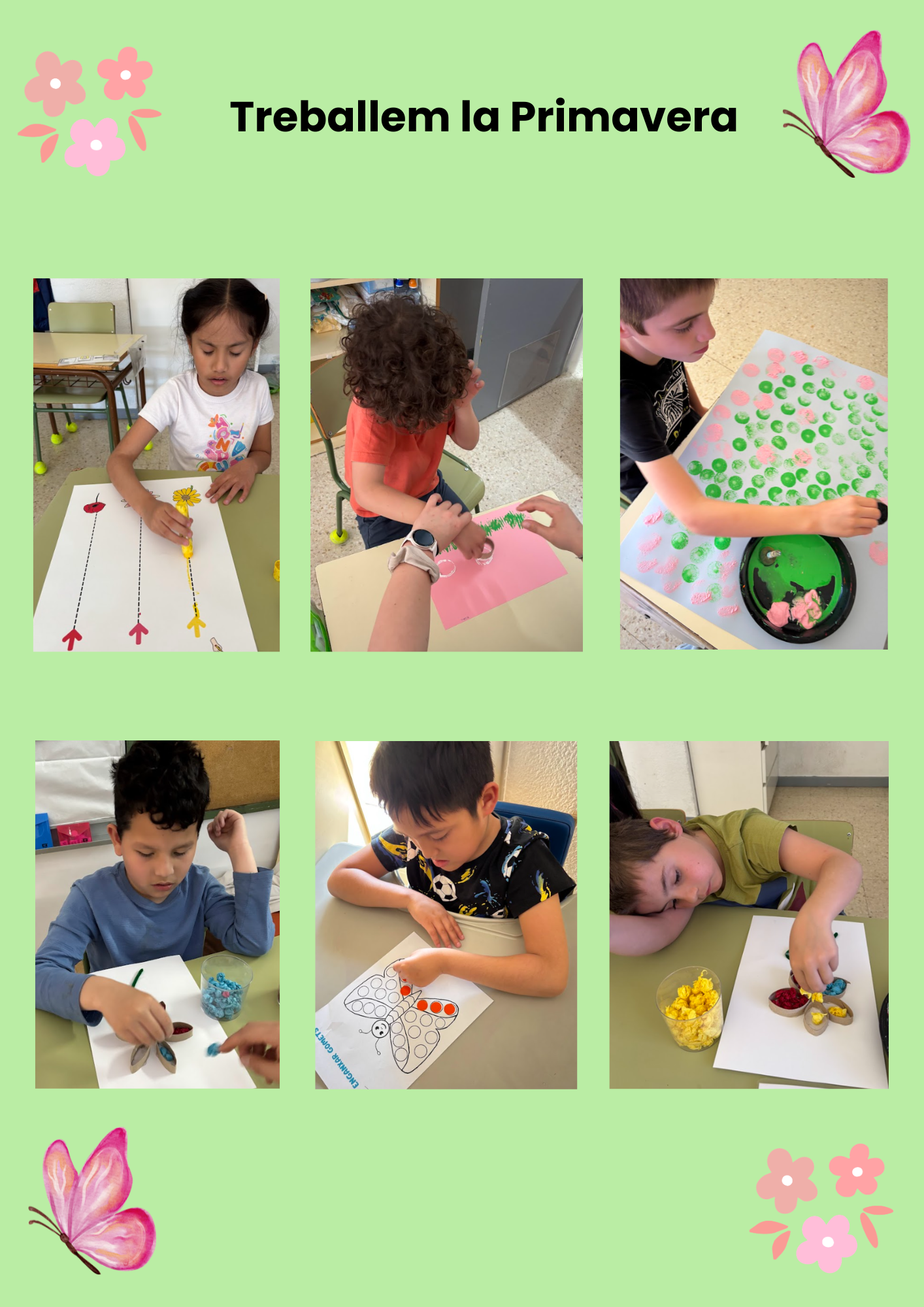 Els alumnes han participat en propostes adaptades com l’estampació amb esponges per crear un mural de flors, la confecció de flors amb paper de seda, i la decoració de papallones amb pintura i gomets, explorant formes i colors.
