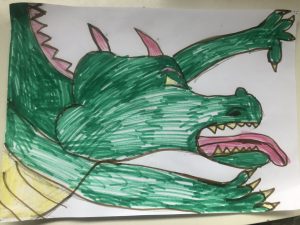 Aaron! Quin dibuix del drac de Sant Jordi més maco!! Estas fet un artista!!