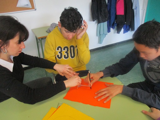 El grup de TVA1 va realitzar una cosa semblant, però utilitzant el compàs i també el regle. Els alumnes van marcar un cercle dins del cercle gran, els van pintar i després van marcar les línies rectes. Acte seguit, ho van retallar tot i va quedar un acolorit trencaclosques. Va ser molt entretingut, doncs era el primer cop que empraven un compàs!
