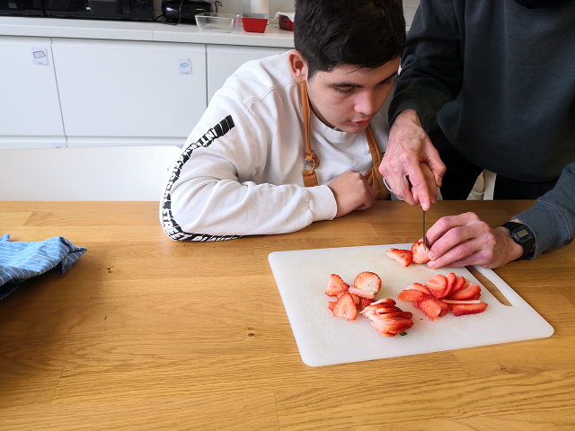 La recepta triada ha estat un brownie sense gluten. La base de la seva elaboració és la següent: xocolata per fondre, mantega, ous, sucre blanc i sucre morè, farina d’arròs, cacau en pols i nous. Un cop l’hem tret del forn l’hem decorat amb maduixes laminades.