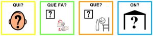 És una forma molt lúdica i vivencial de treballar l’estructura de la frase amb anècdotes del nostre entorn. Per a fer-ho responem a les preguntes: “Qui?”, “Què fa?”, “Què?” i “On?”.