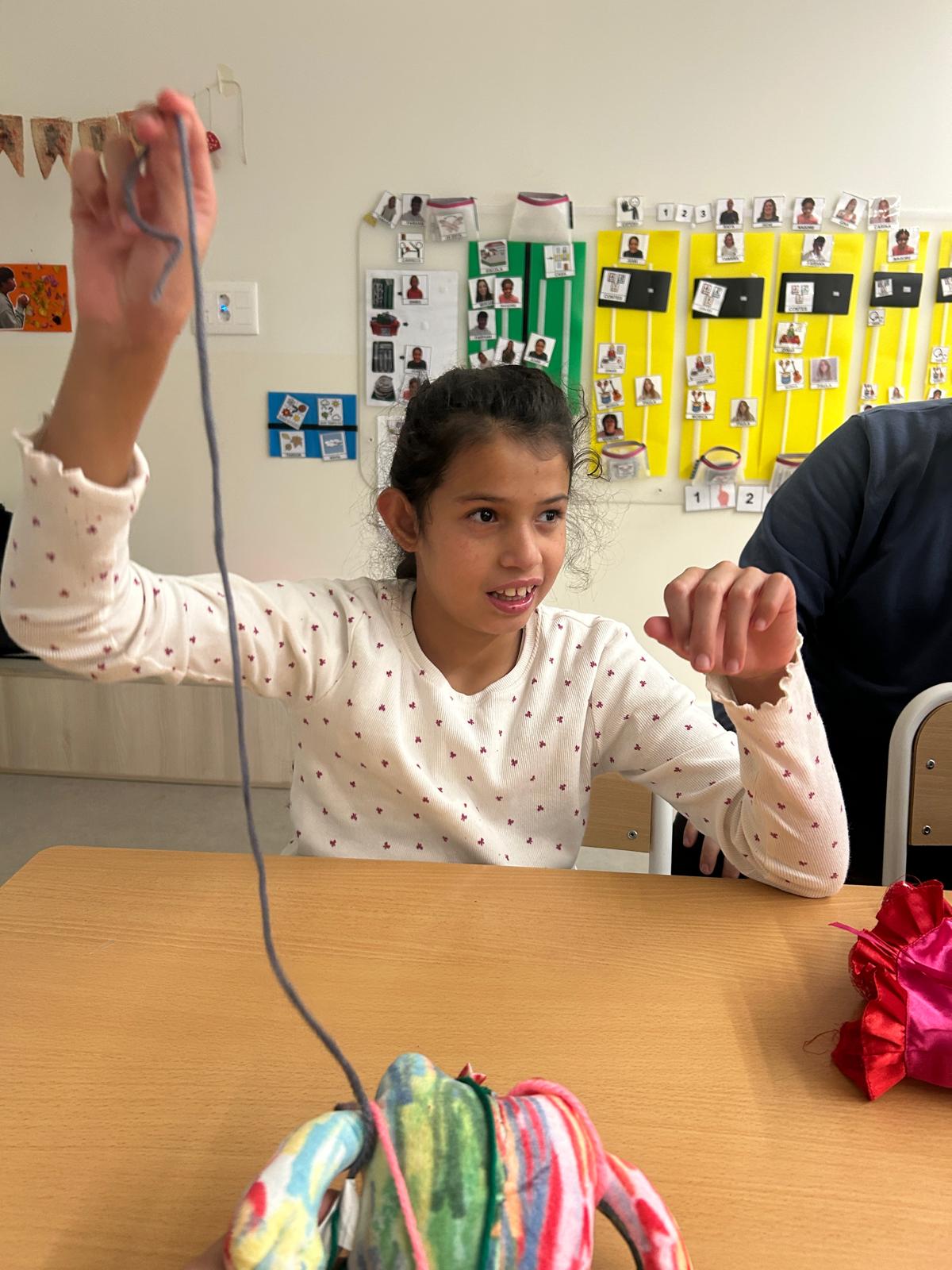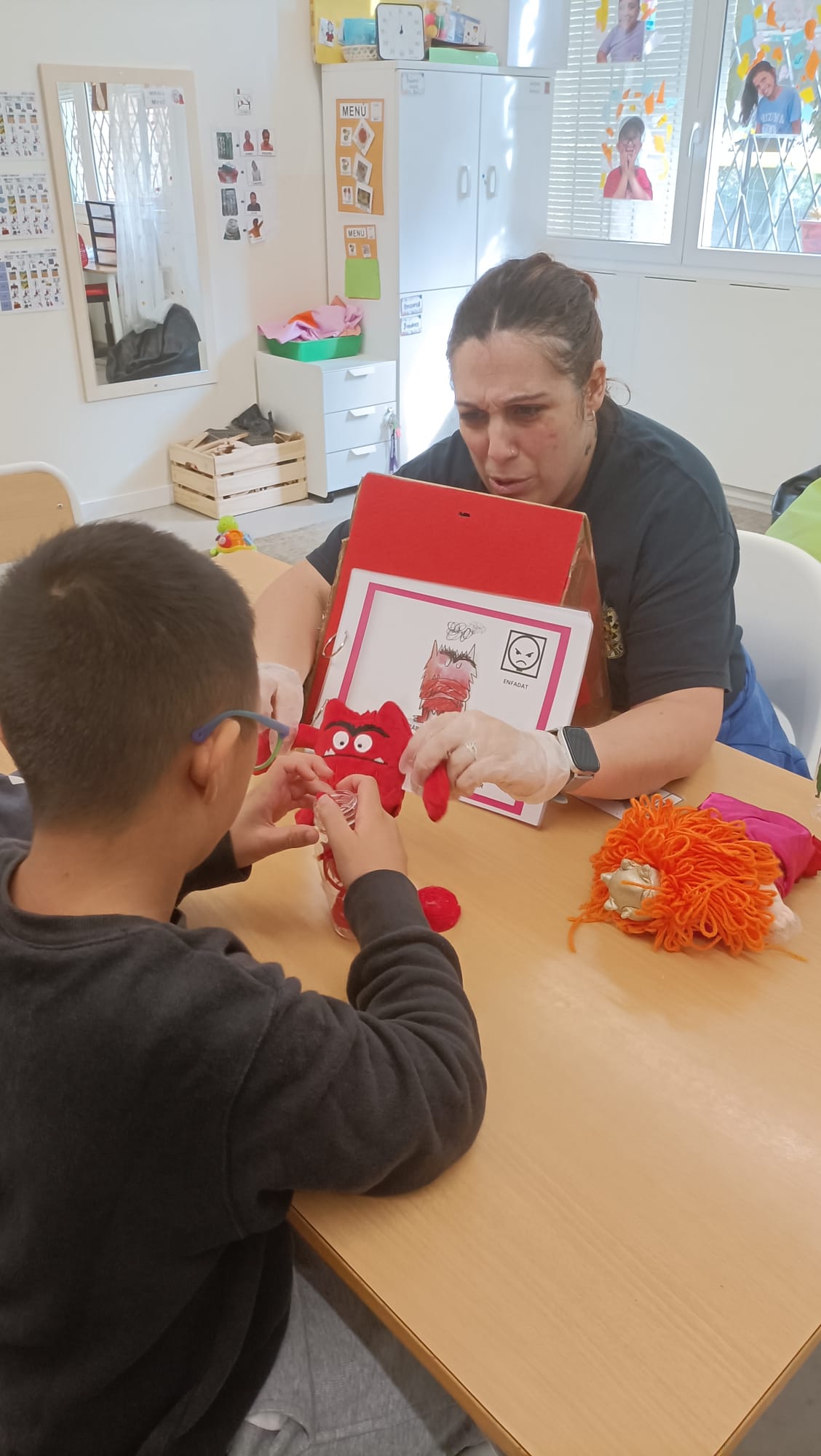 Van representar com se sentia, van relacionar-les amb cada monstre i el seu color i vam ajudar-lo a desembolicar els seus fils per ficar-los a l’ampolla de l’emoció corresponent.