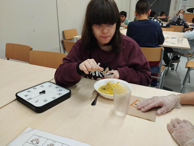 L’hora de dinar és una activitat molt important en el dia a dia de l’escola. Durant aquesta estona els i les alumnes treballen moltes habilitats en els diferents àmbits. Permet que els i les alumnes provin i acceptin aliments i/o textures noves per a ells/es i fomentar els hàbits d’autonomia i potenciar la comunicació a través dels plafons, els gestos o les paraules.