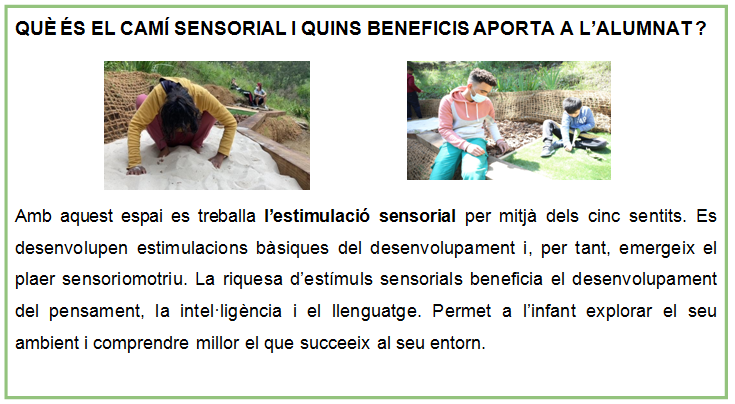 Us volem informar del projecte que s’ha posat en marxar a l’escola per tal de gaudir d’un espai envoltat de natura, en què els alumnes han participat en el procés de construcció del nou CAMÍ SENSORIAL ubicat al jardí de l’escola.