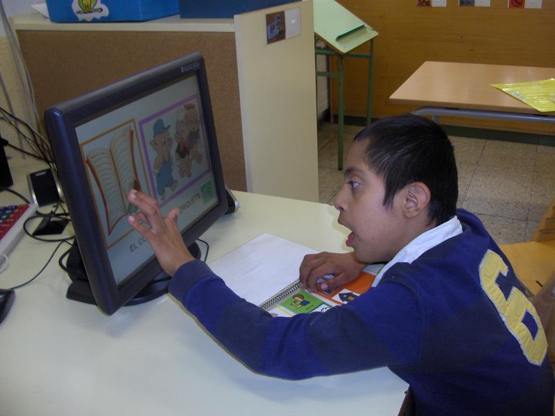 Hem treballat “el conte dels 3 porquets”. Fem servir la pantalla tàctil com a comunicador. Quan toquem les imatges sona la veu que prèviament hem gravat i estimula l’atenció auditiva i la repetició oral.
