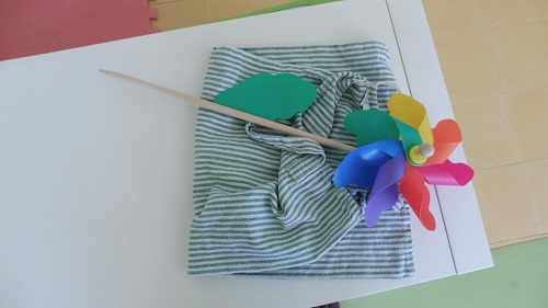 En l’activitat de cançons, el nen/a tria quina cançó cantarà el grup agafant de la caixa una de les bossetes. Aleshores la mestra presenta el contingut de la bossa per preparar la cançó i es crea una dinàmica amb els objectes mentre canten. Per exemple, en la cançó dels colors, repartir les cintes entre els nens i quan la lletra de la cançó parli d’un color concret, el nen que té aquella cinta la fa ballar.