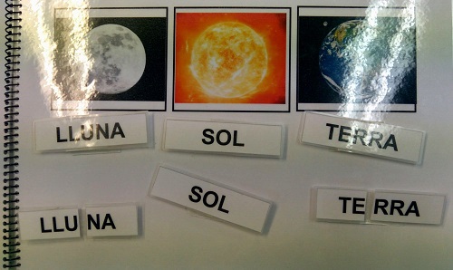 Juntament amb aquest material s’utilitza un llibre de lectura de paraules creat d’acord amb la temàtica de l’interès de l’alumne. Es tracta d’un llibre d’imatges on el nen/a hi haurà d’associar la paraula global corresponent (funciona bé amb el sistema de velcro tal i com es pot veure a la imatge). Una vegada assolida la fase de lectura logogràfica (imatge-paraula global), s’inicia el treball pel coneixement de les unitats més petites que configuren aquesta paraula; primer la síl·laba (cop de veu) i després la grafia (fonema). Aquest treball es realitzarà amb el suport del material del castell.