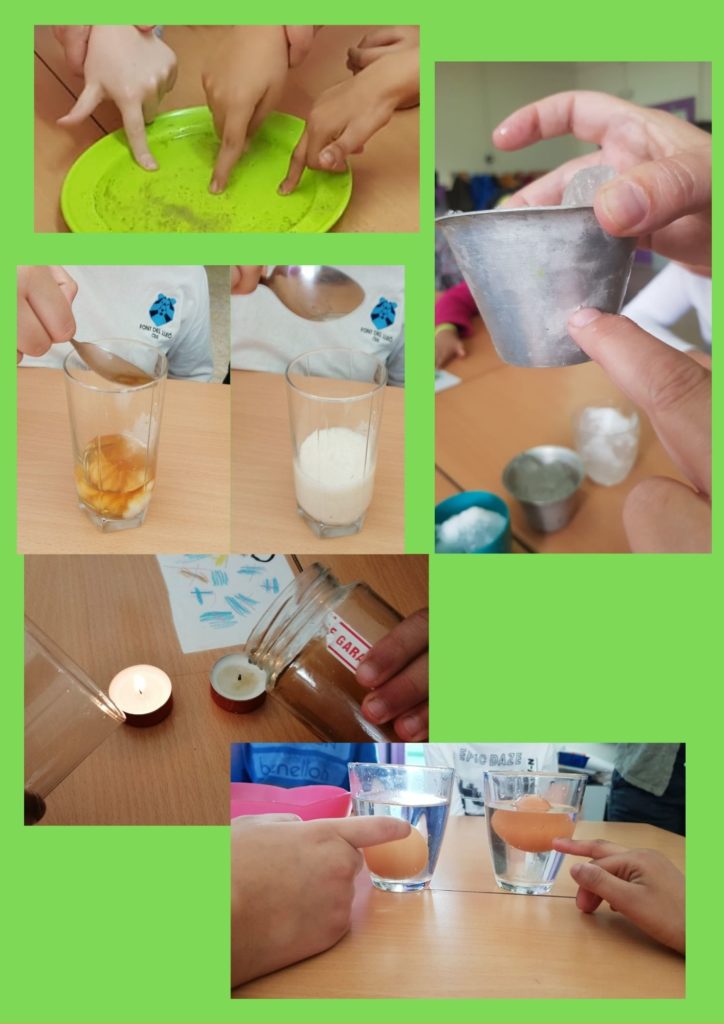 A l’escola donem molta importà ncia a la observació i experimentació dins el procés d’aprenentatge dels nostres alumnes. A l’aula dels pops aquest curs hem portat a terme forces activitats d’experimentació relacionades amb l’à rea de medi natural i matemà tiques. Plantegem experiments senzills relacionats amb conceptes i coneixements cientÃfics a nivell molt bà sic, on l’objectiu és aprendre a seguir unes indicacions, formular hipòtesis i pensar possibles solucions a un problema. Hem experimentat amb l’aigua, l’aire i amb petites reaccions quÃmiques. Hem après com crear nous colors seguint els principis de la capil·laritat, com apagar una espelma sense bufar, com fer surar un ou, hem escrit amb tinta invisible , hem construït un paracaigudes … També hem fet petites activitats d’experimentació relacionades amb l’à rea de matemà tiques per aprendre les mesures de pes i capacitat i saber fer equivalències. Â