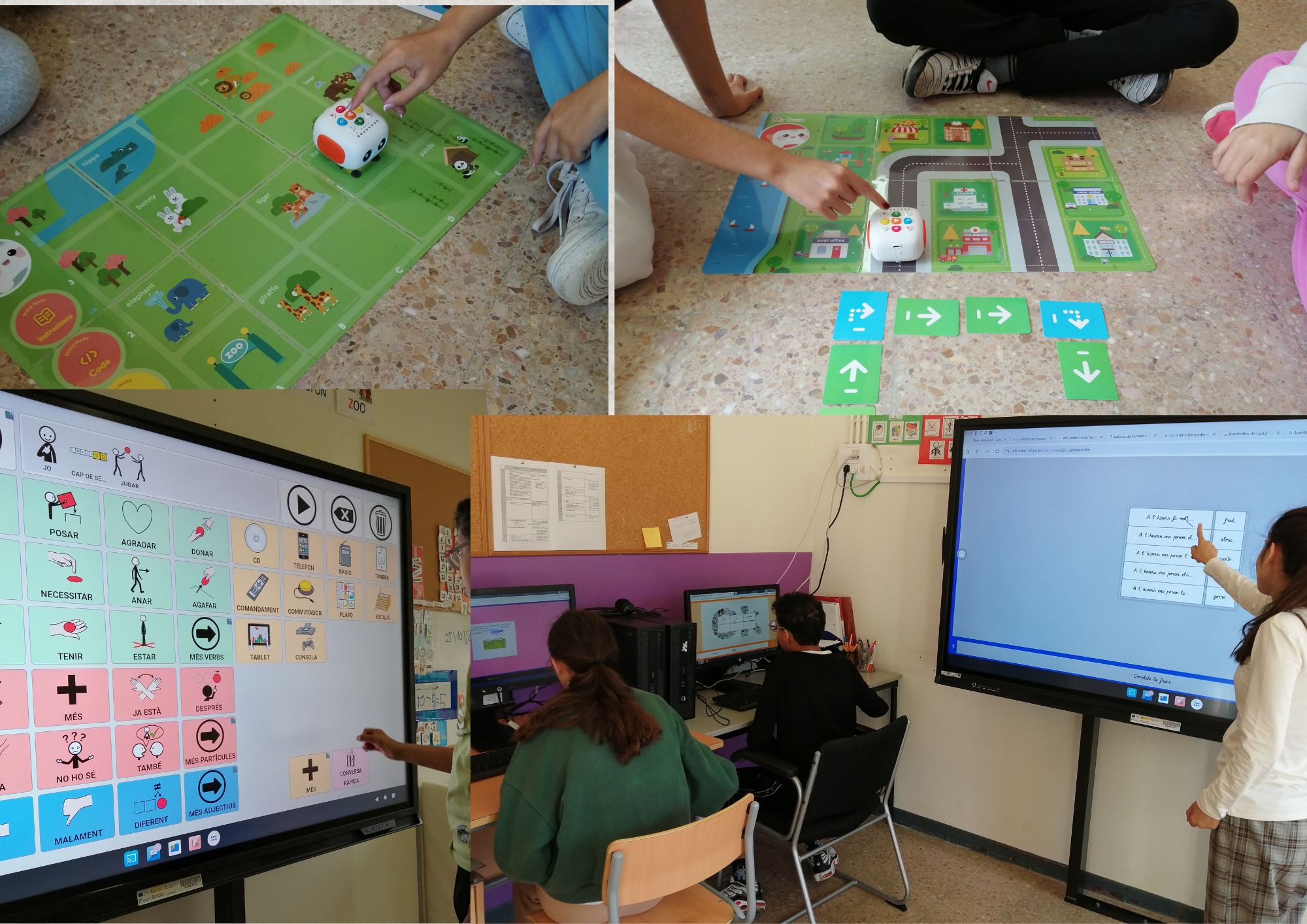 A l’aula dels elefants fem diferents activitats per treballar l’àrea digital. Tenim dos ordinadors que utilitzem per buscar informació a internet, passar textos al word, aprendre a dissenyar amb canva, treballar online o buscar música. Tenim una nova pantalla digital i aprenem a utilitzar les possibilitats de la pissarra, mirar videos ,buscar llocs i itineraris al google maps i també per projectar el programa asterics grid com a suport a la comunicació. Aquest curs també hem començat a fer robòtica.