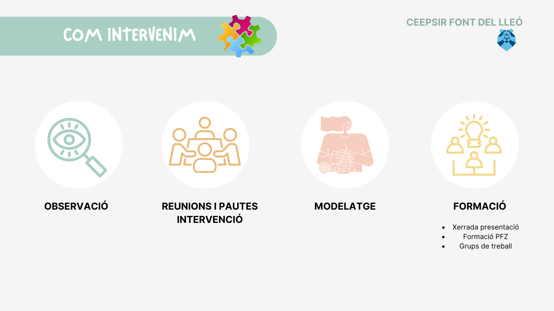 • Paral·lelament es realitzen diferents moments de formació, a l’inici de curs es presenta el recurs del CEEPSIR i CEEPSIR Font del Lleó. Dins del Pla de Formació de Zona l’escola té una formació reconeguda pel Departament on s’aborden diferents temes, des de l’autisme, accessibilitat, DUA, SAAC i altres sistemes de treball. I juntament es fan grups de treball per posar en pràctica els diferents temes programats.