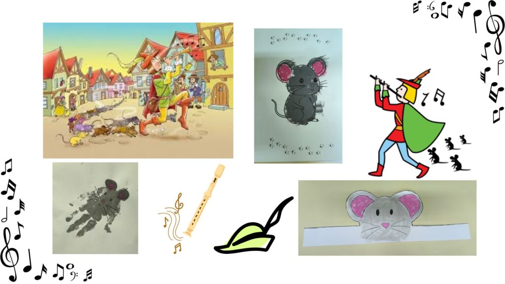 Els camaleons estem treballant el conte del Flautista d’Hamelín. Hem explicat el conte tradicional i també hem vist versions digitals, hem escoltat la música del conte i hem vist com és una flauta, com sona i com es toca i ens va agradar molt descobrir aquest instrument i el seu so. Hem fet camins amb pintura amb els nostres dits, com si fóssim els ratolins que marxen del poble, ratolins amb les nostres mans i hem fet la disfressa de carnaval, ja que anirem de ratolinets i flautistes.