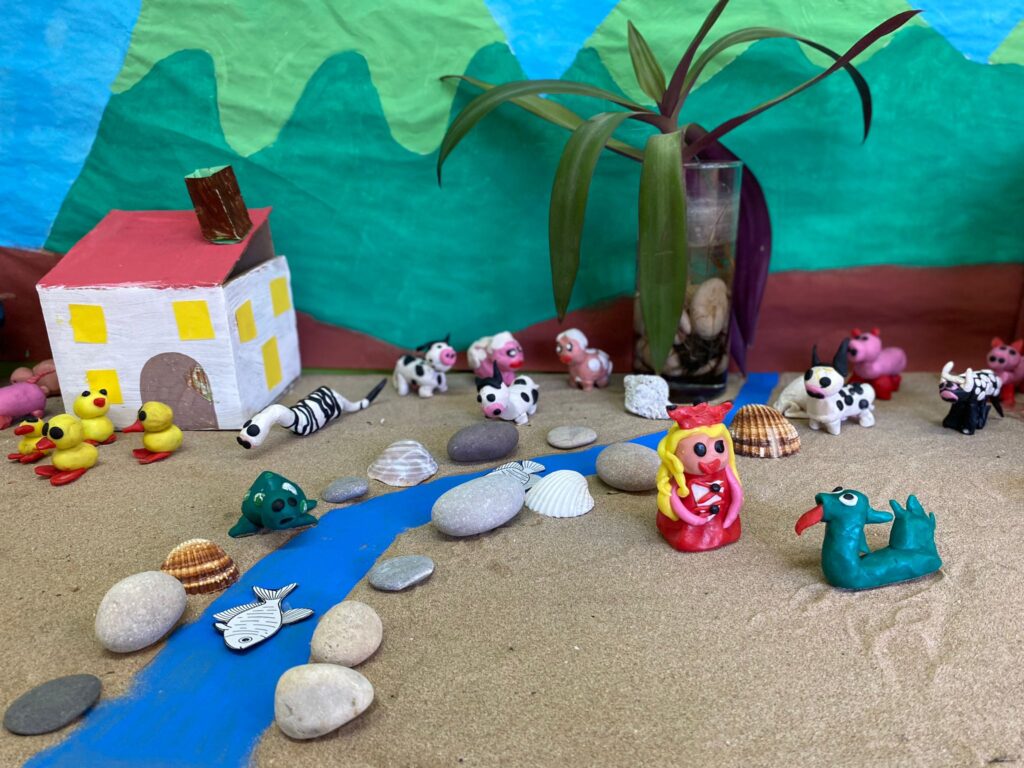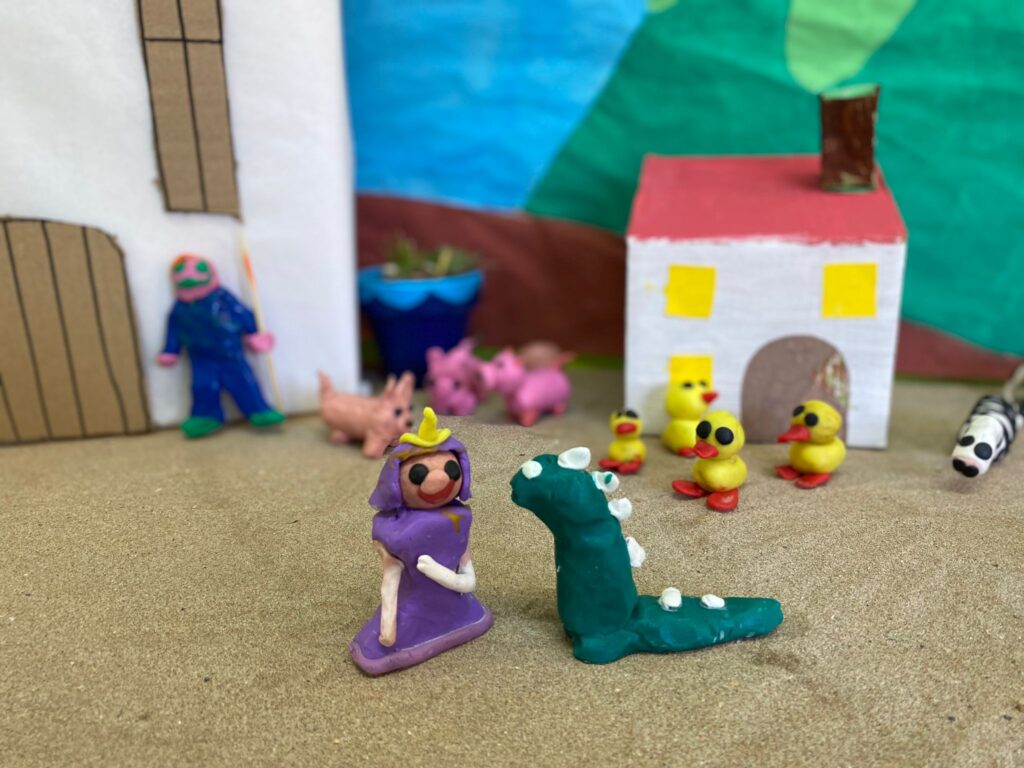Els i les alumnes de l’escola han recreat diferents escenes de la llegenda de Sant Jordi. Per això, han desplegat tota la seva creativitat i traça per elaborar amb plastilina els diferents personatges i escenaris.