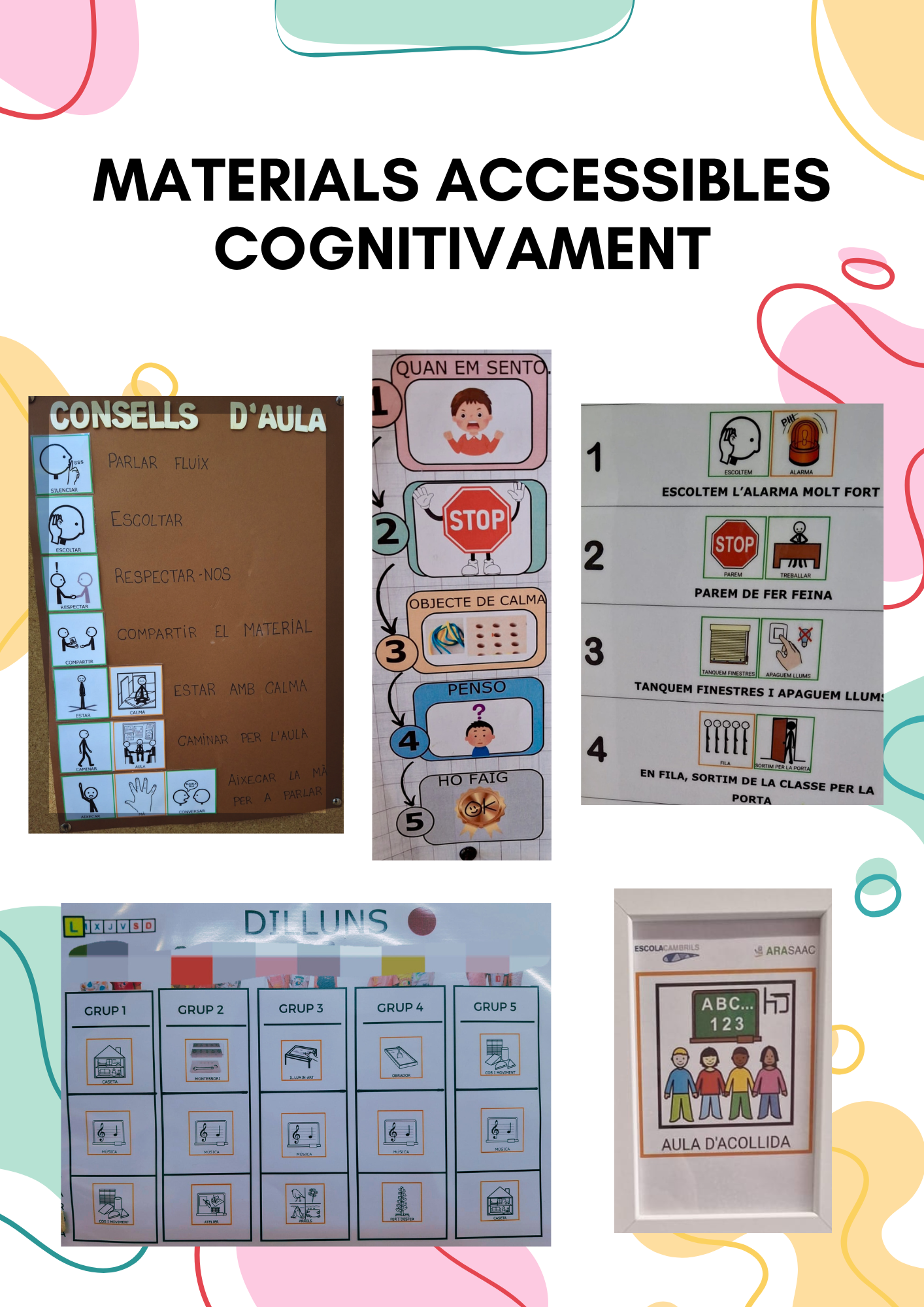 Aquestes fotos són un recull d’exemples de materials accessibles cognitivament que ens hem trobat a les escoles a les que anem a assessorar. Les bones pràctiques com aquestes impliquen un pas endavant per crear una escola visual i inclusiva. Els entorns neuroafirmatius s’adapten a tot l’alumnat i fan el contextos més comprensibles. Què us semblen aquests recursos visuals?