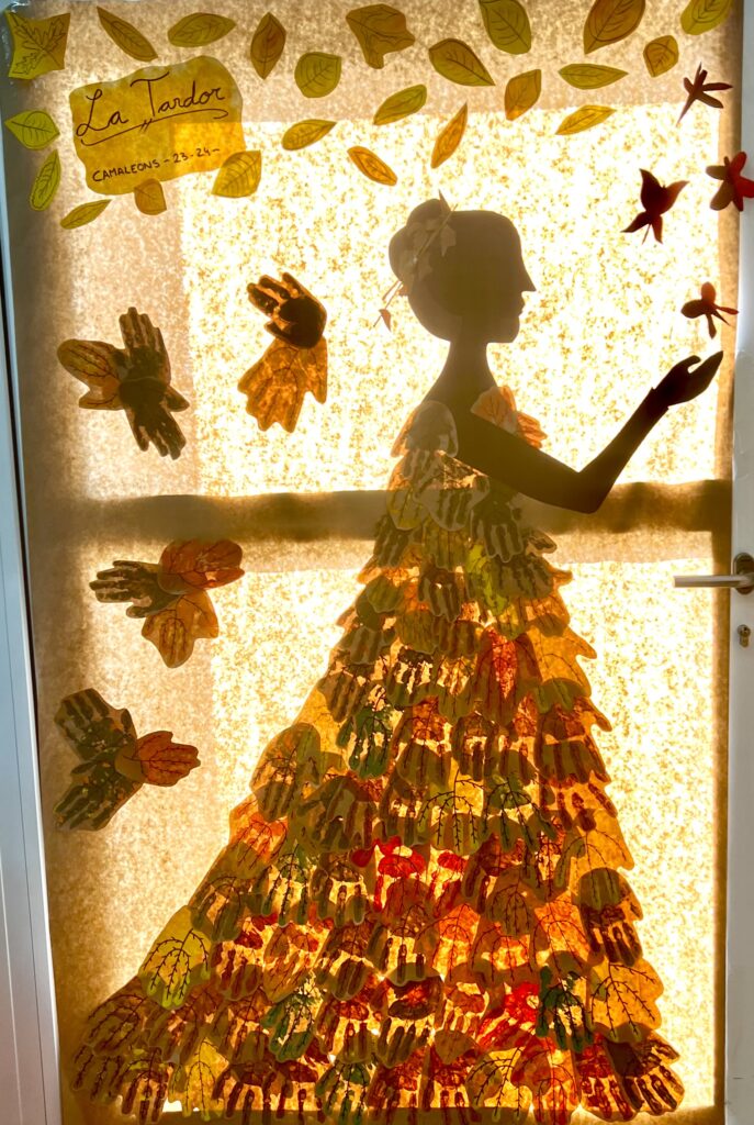 Hem pintat mans de colors marrons, verds, taronges, etc. i amb l’ajuda dels mestres hem pogut convertir les nostres mans en fulles ben maques. Aquestes les hem utilitzat per crear un vestit a una silueta que volem representar com La Tardor col·locant-les des de la part inferior a la superior del mural.
