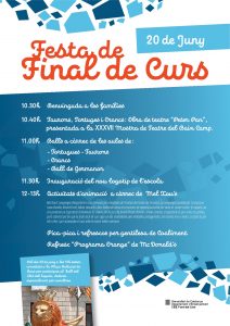 Festa de final de curs admin19/06/18 El proper dimecres 20 de juny celebrarem la Festa de final de curs amb tots els alumnes de l’escola i les seves famílies. Aquí us deixem el programa de la festa: