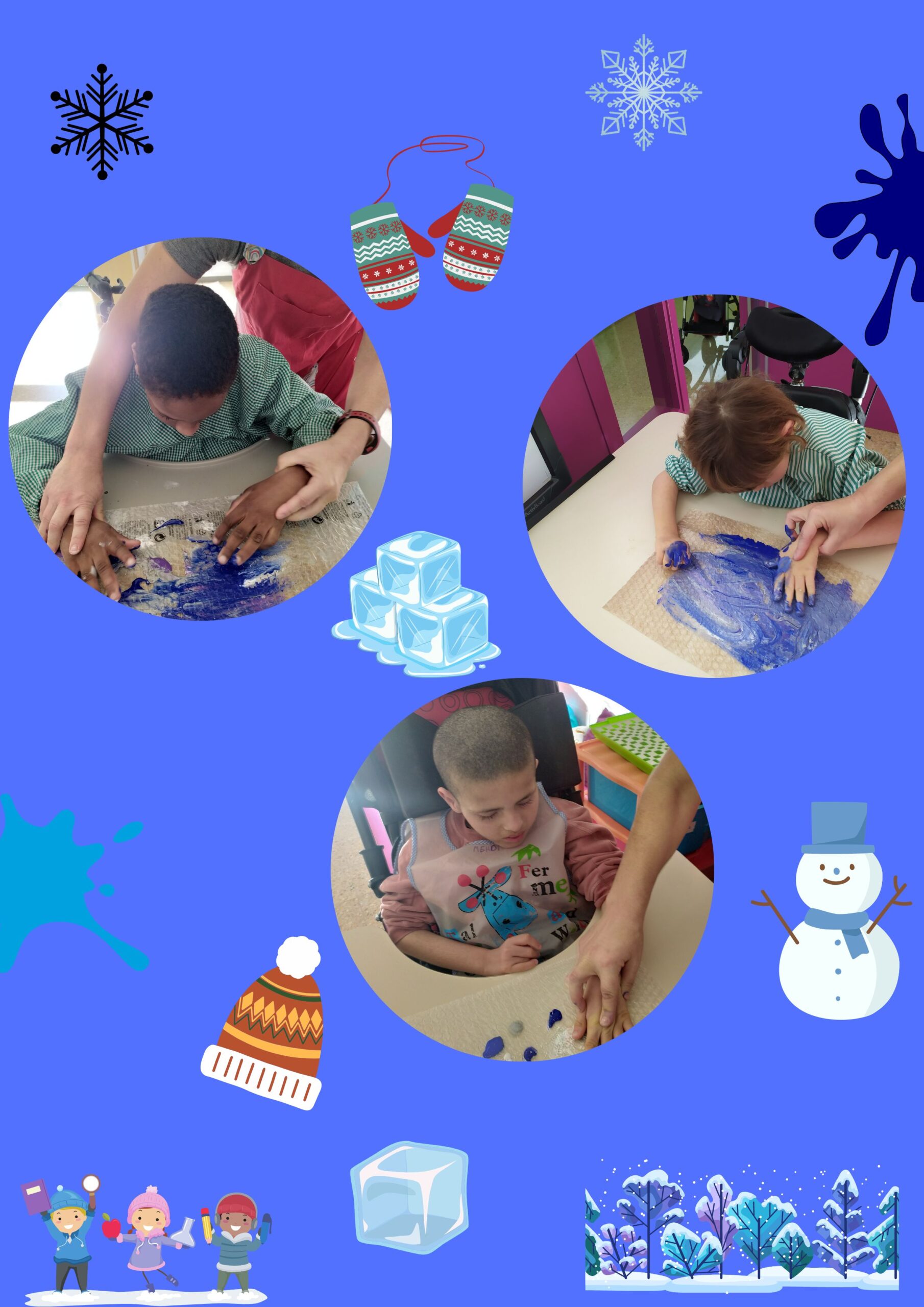 Aquest mes de gener ha arribat amb un fred hivernal que es resistia a venir i per això estem treballant l’hivern. A les nostres creacions plàstiques estem utilitzant colors freds: totes les tonalitats de blaus, grisos i blancs. Hem fet flocs de neu per decorar els vidres de les finestres i hem pintat amb gel. Hem experimentat amb glaçons per treballar els canvis de temperatura, les sensacions que ens produeix el fred…