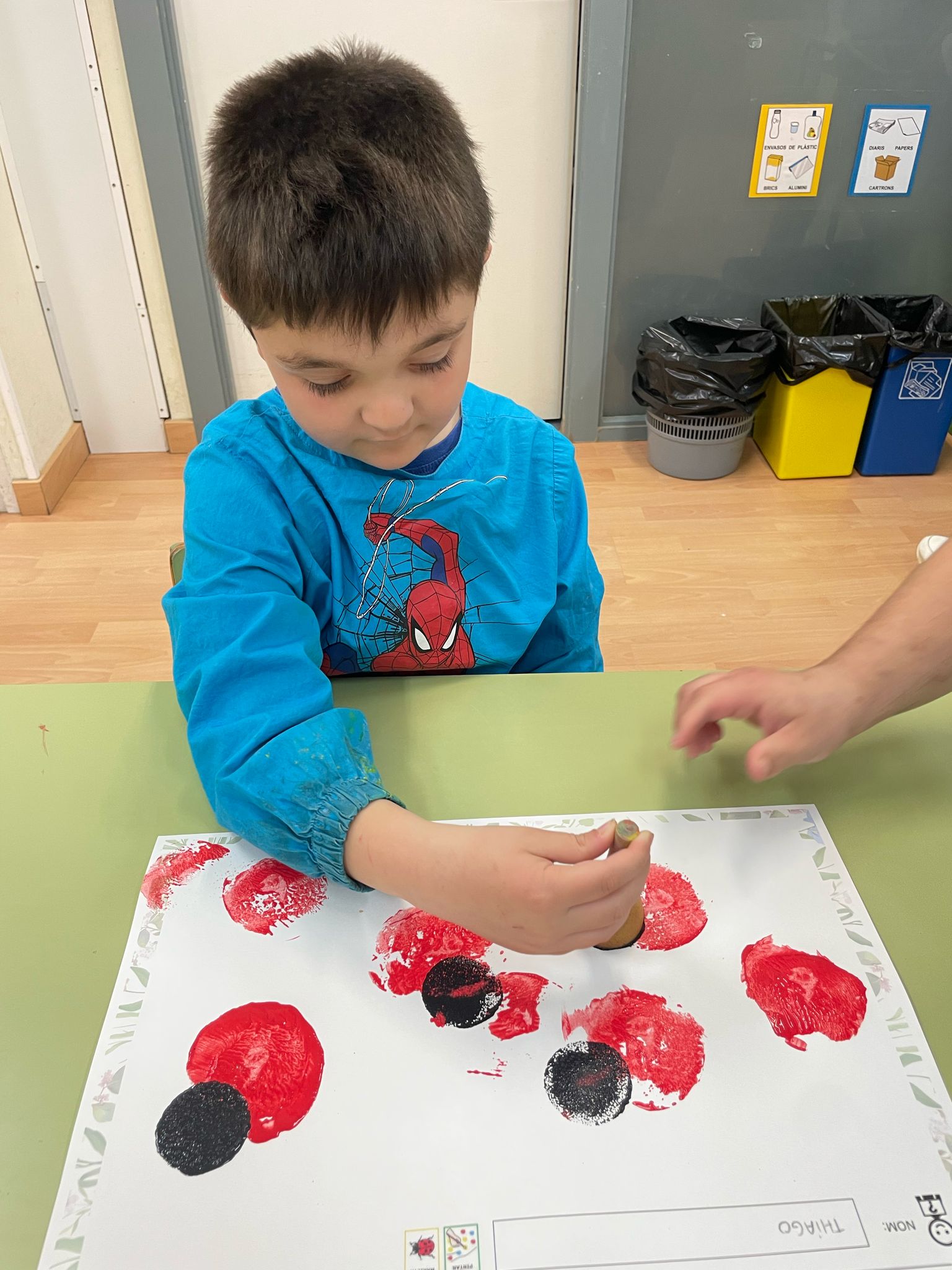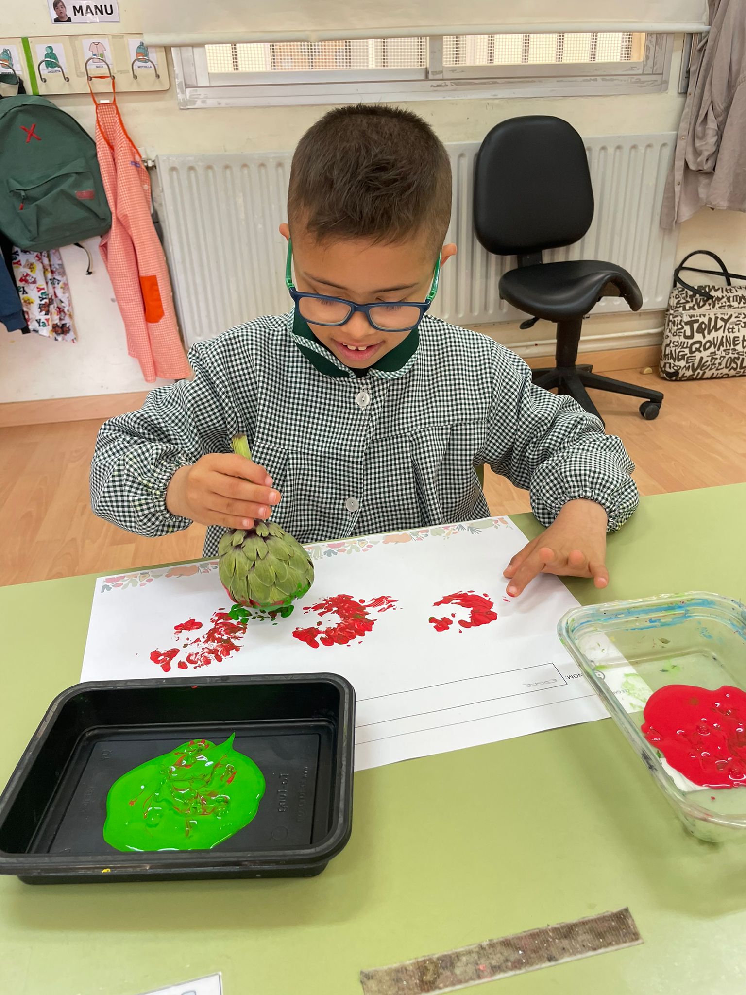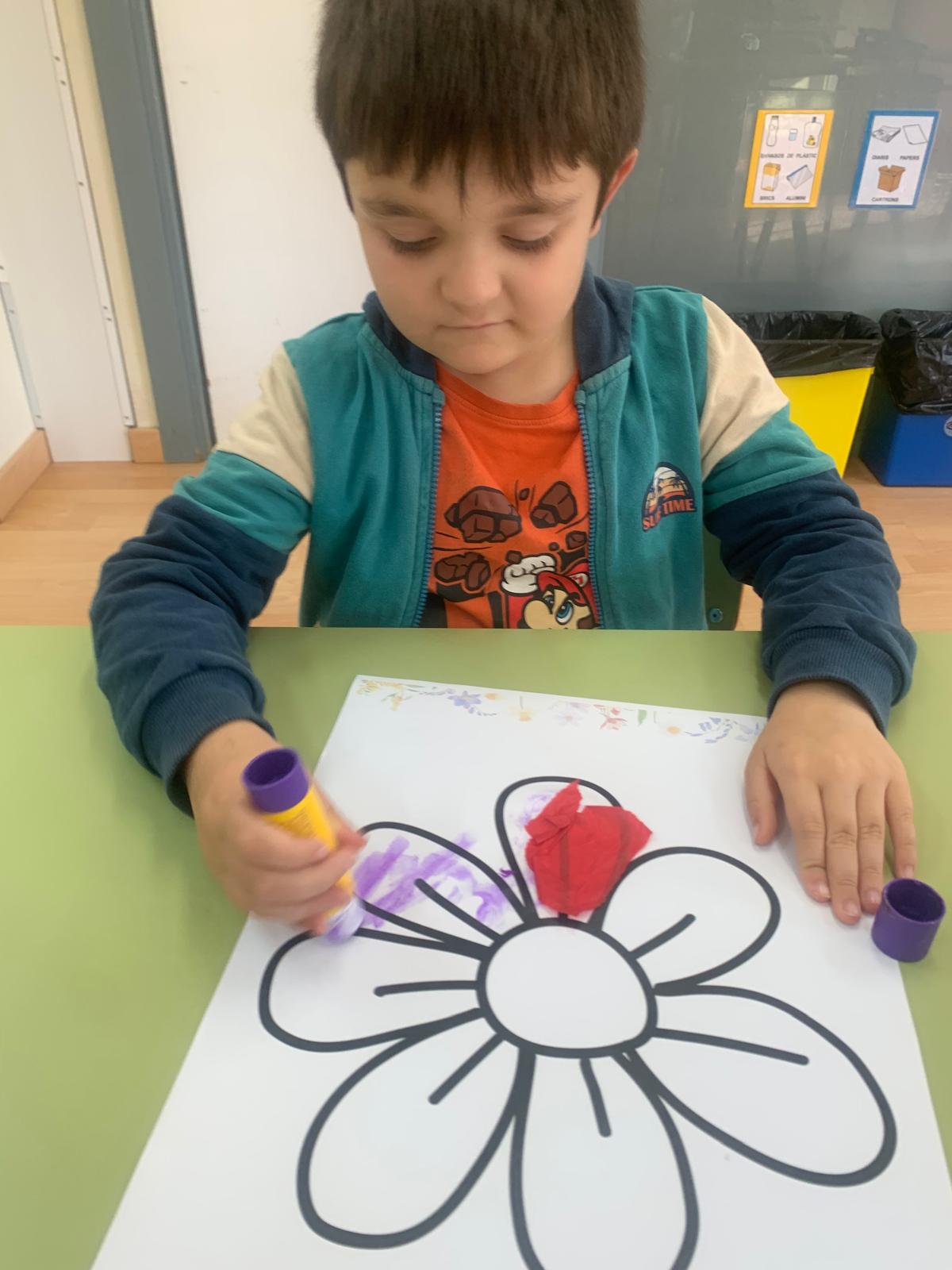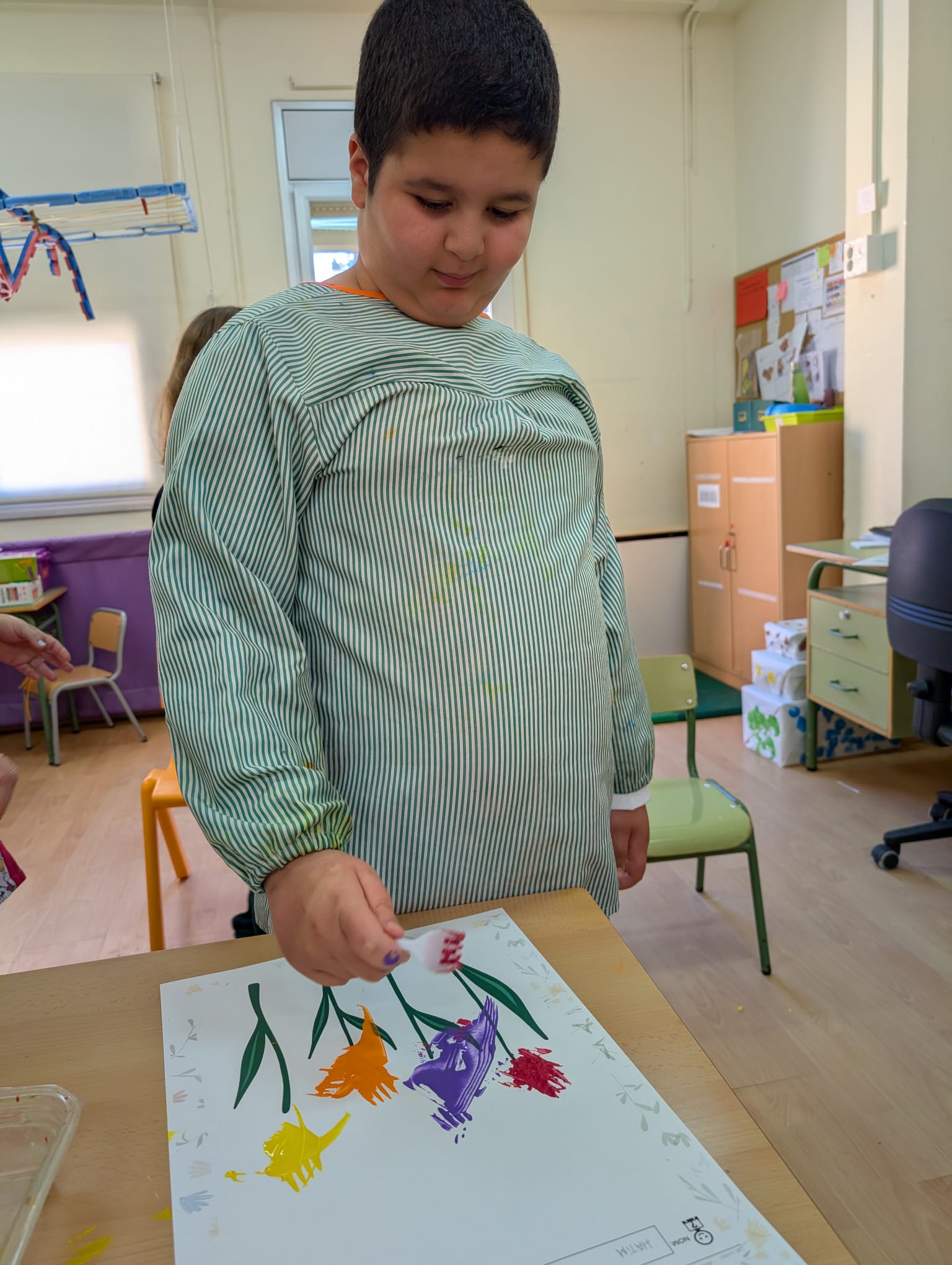 La classe de la Mulassa estem treballant la primavera! Hem estampat patates com si fossin marietes, hem fet flors amb forquilles, hem experimentat amb diferents elements relacionats amb aquesta estació com ara les flors naturals i els insectes, hem estampat el rusc de les abelles, hem decorat flors amb papers de seda, hem pintat amb carxofes, hem treballat amb la taula de llum, i fins i tot ens hem decorat el nostre cap amb flors de diferents colors!! També hem tastat fruits típics d’aquesta estació.