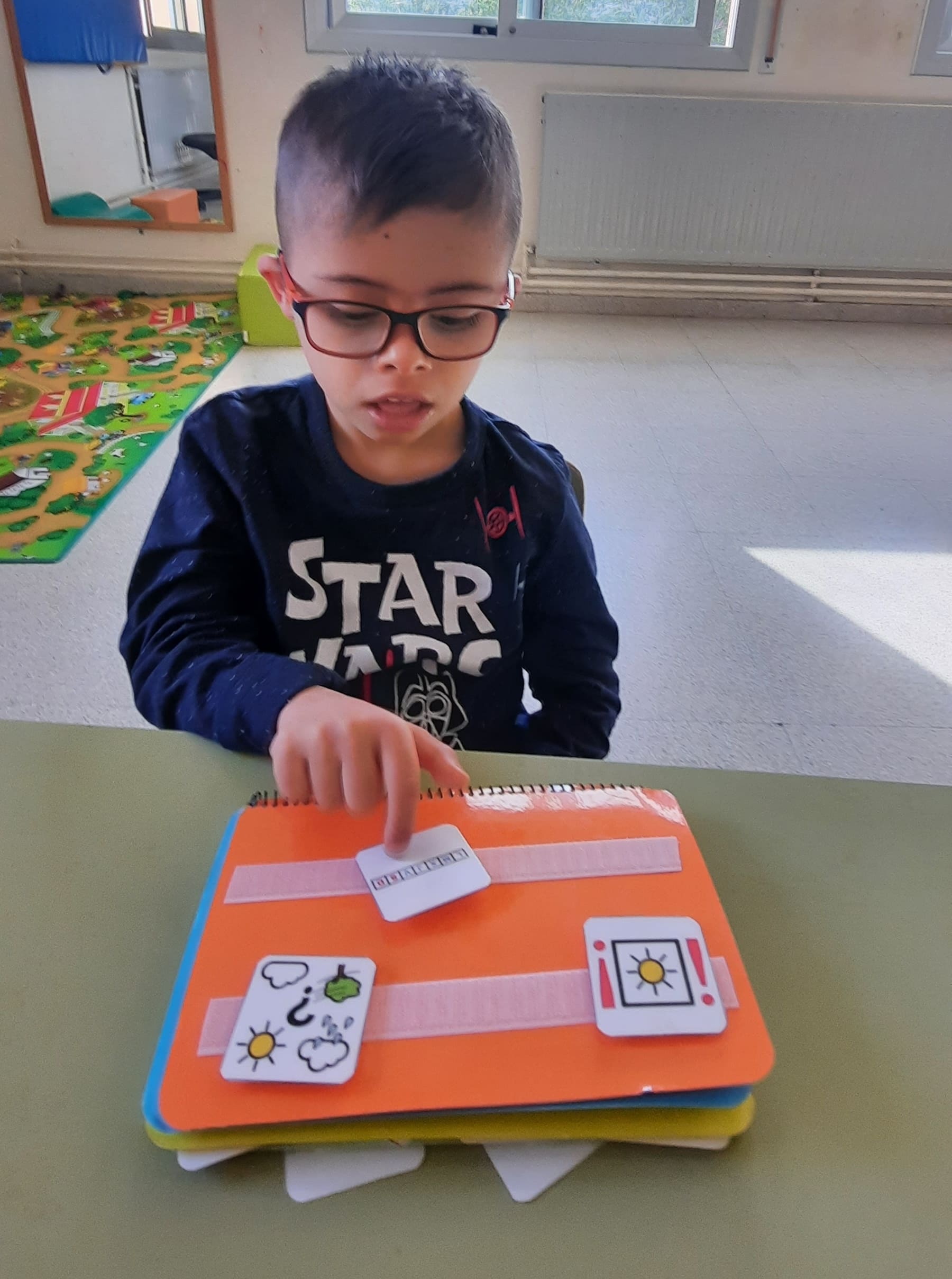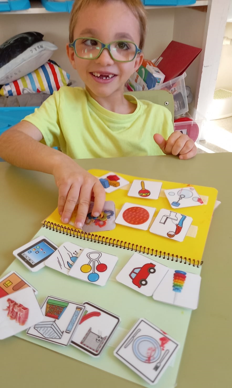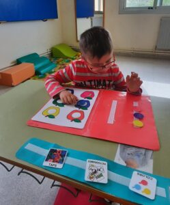 Fem ús dels pictogrames en els horaris visuals, que ens resulten útils per anticipar situacions i saber què fem en cada moment del dia i en les tires de treball que ens ajuden a seqüenciar les tasques que hem de fer durant l’estona de treball. També fem servir les nostres llibretes de comunicació per fer les rutines a la classe, per treballar i per demanar moltes coses!