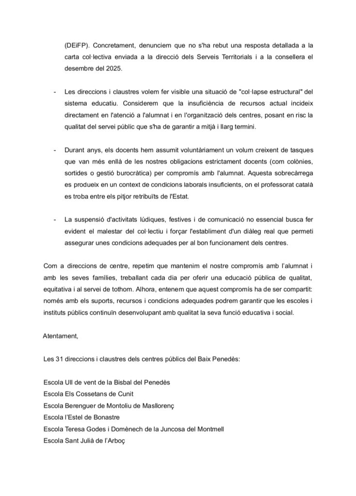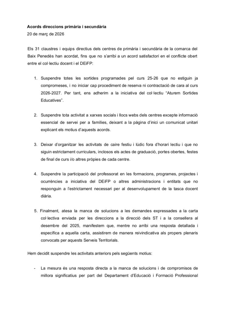 COMUNICAT DE LES DIRECCIONS I CLAUSTRES DEL BAIX PENEDÈS