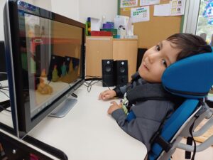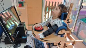 A la Sara li agrada jugar amb l’ordinador a alguns jocs de causa-efecte a través d’un commutador. Escolta sons i músiques diferents cada vegada que dona un cop amb la mà sobre el botó!