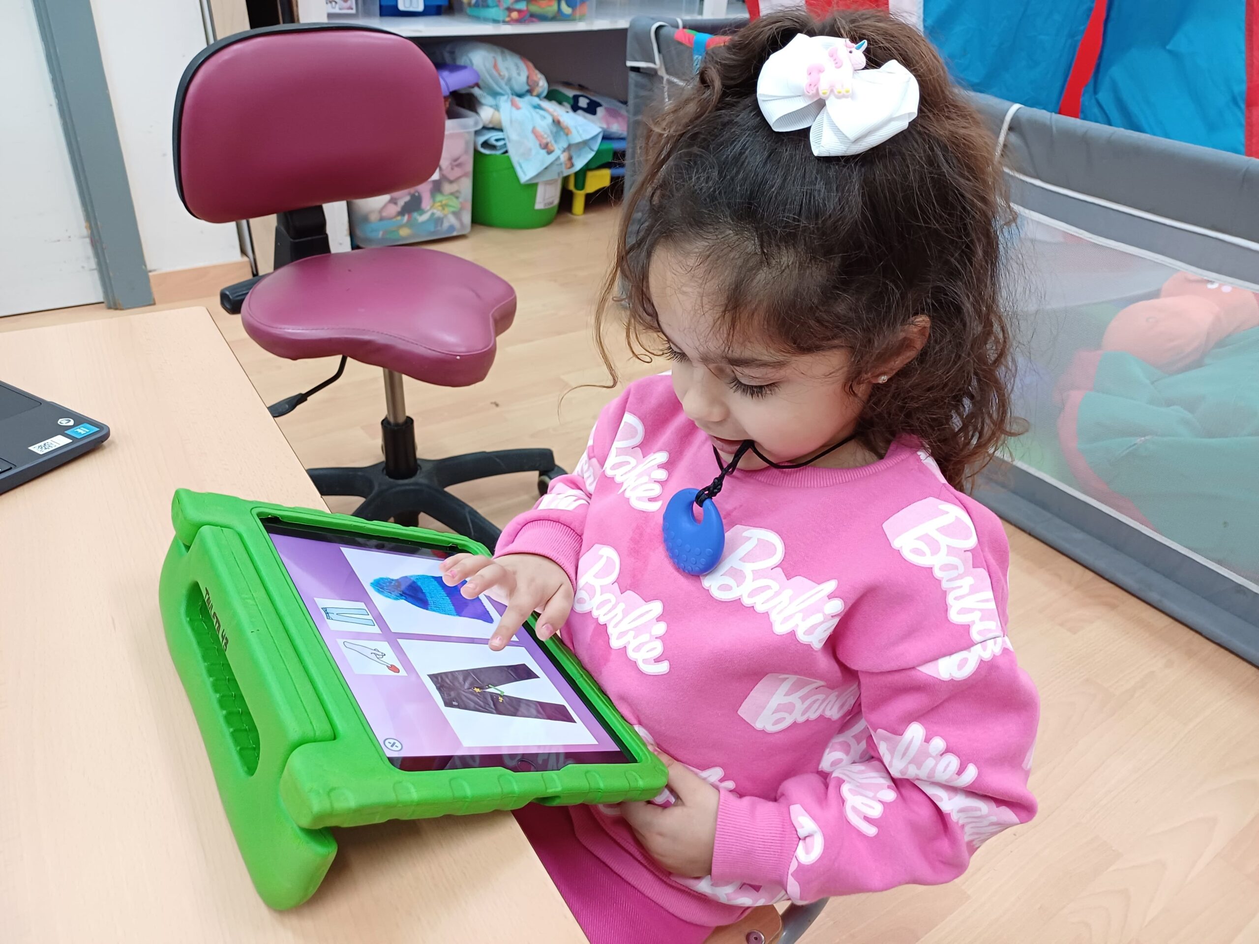 A la Chloe li encanta jugar amb la tauleta i es posa molt contenta quan juga a la pantalla de l’ordinador a diferents jocs matemàtics.