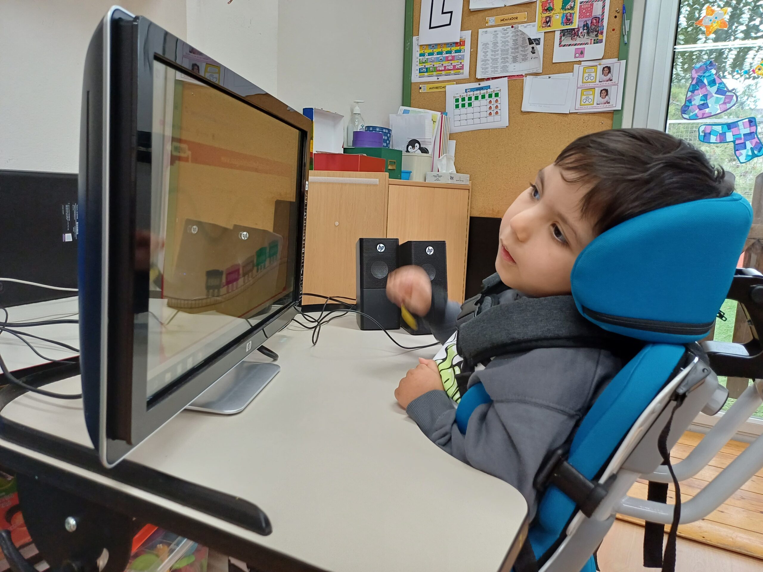 Al Jad també li agrada jugar a l’ordinador amb un commutador petit que porta al canell. Cada vegada que dona un cop amb el botó sobre la taula veu com es mouen alguns elements i escolta diferents sons.