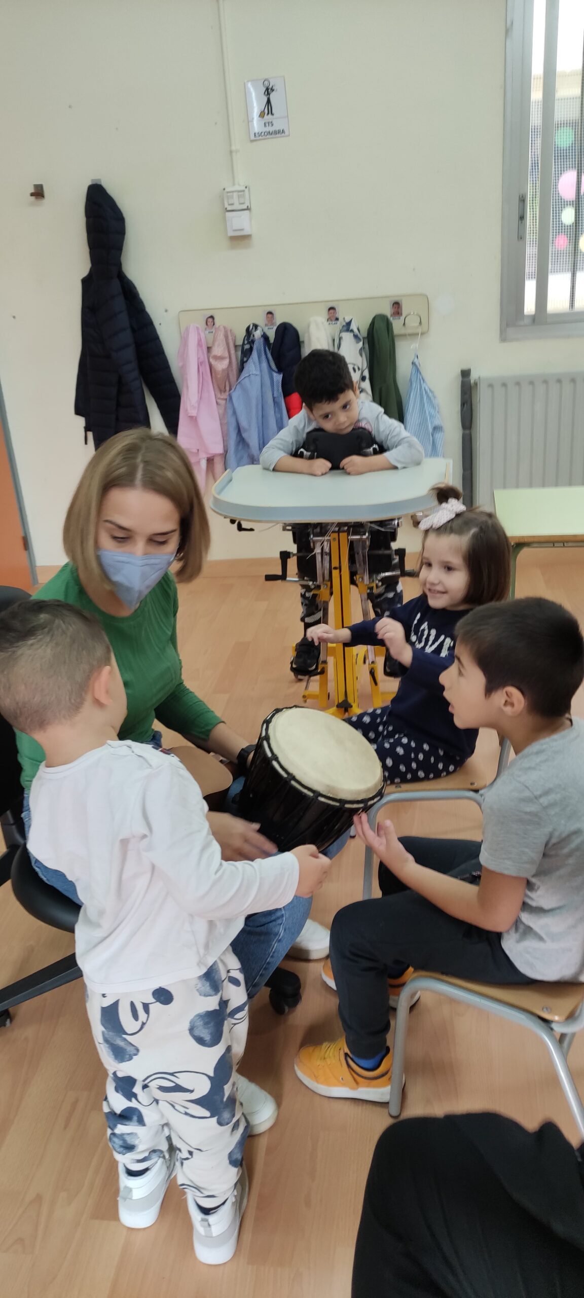 A les sessions de música aprenem a cantar noves cançons, coreografies, interpretem melodies amb instruments, acompanyem cançons amb percussió corporal, fem ritmes amb gots de plàstic… Ens ho passem genial!