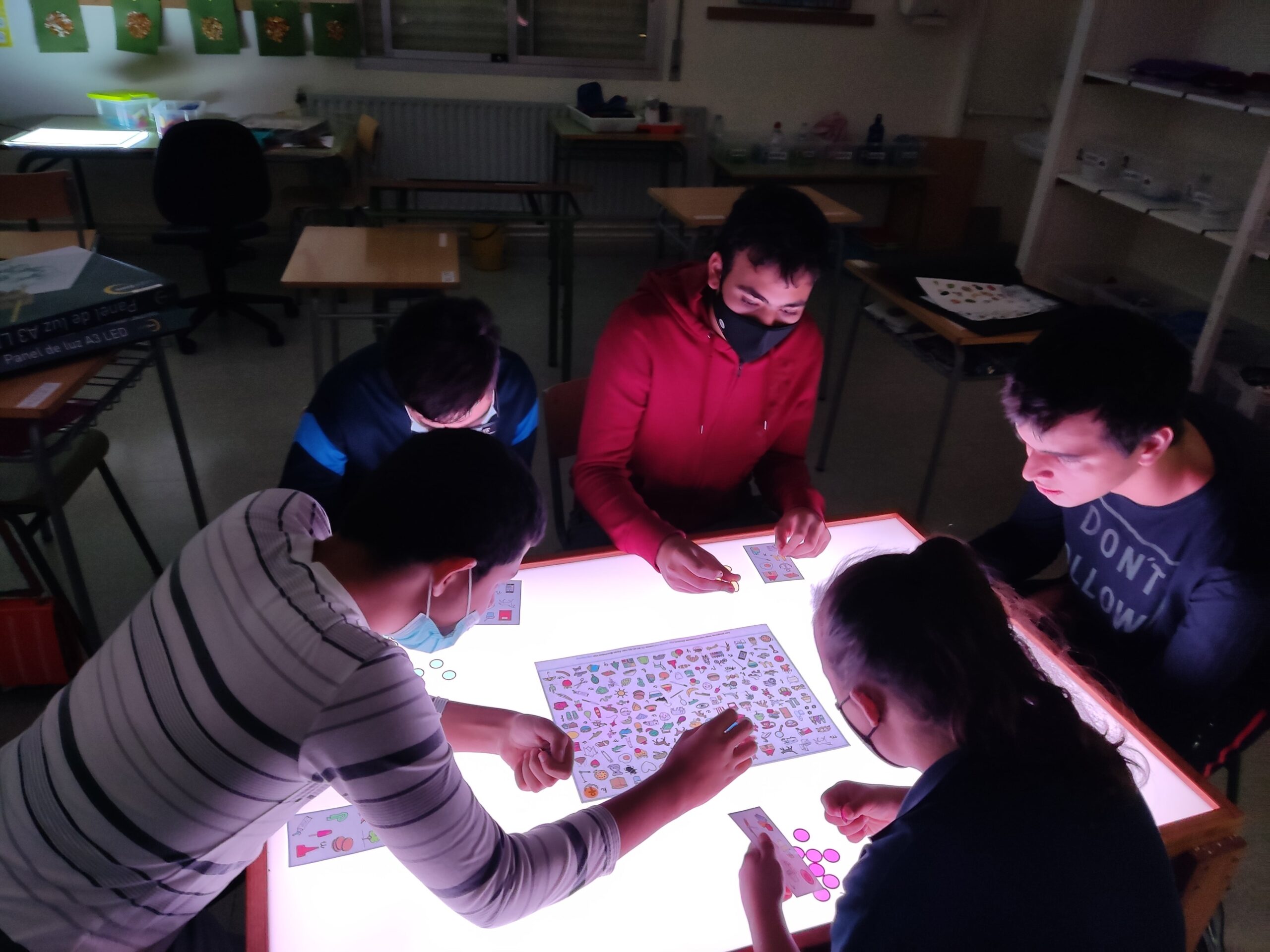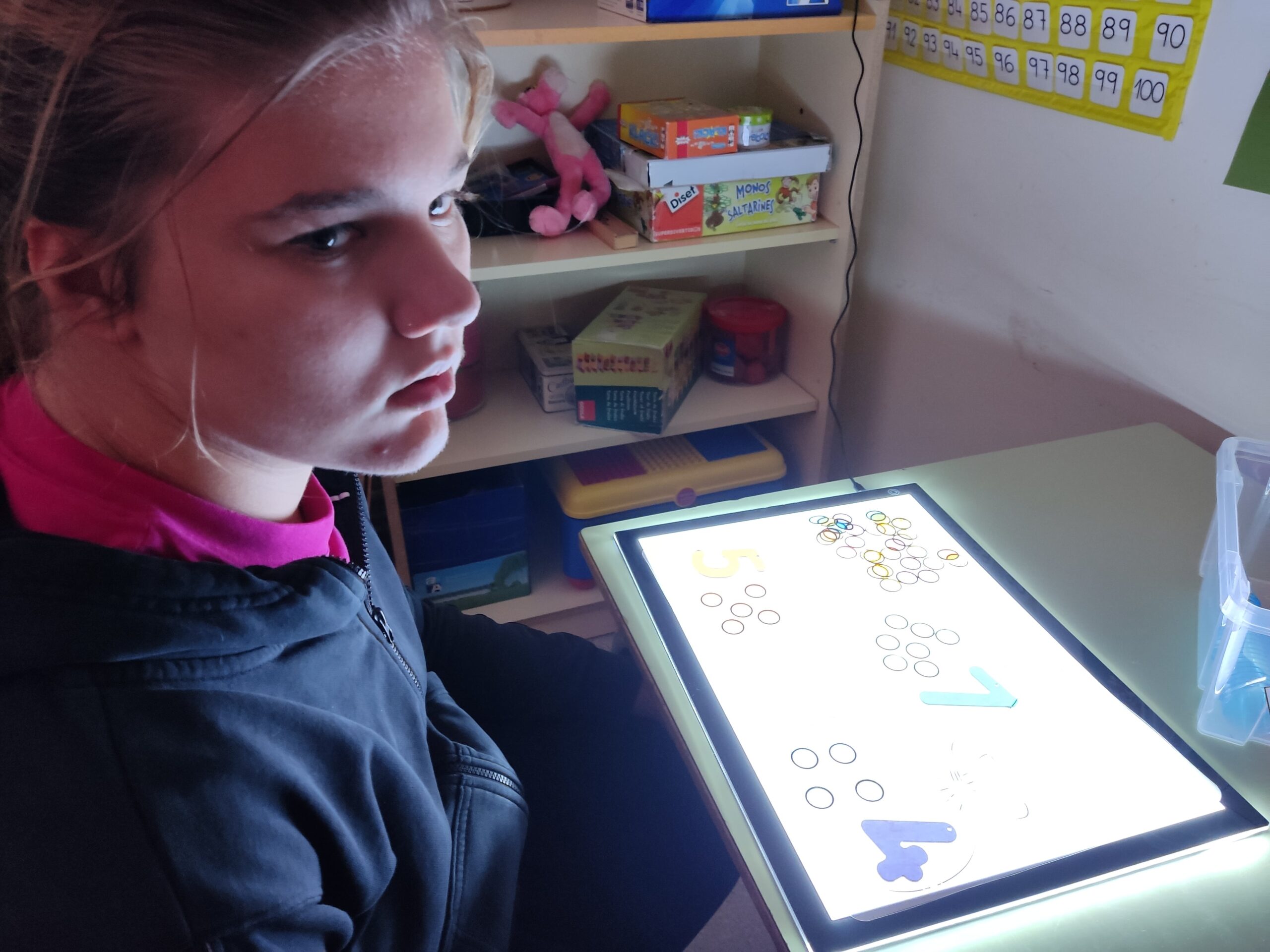 Amb ella treballem la lectoescriptura, les formes geomètriques, les construccions i diferents temàtiques com la tardor o la Castanyada. La llum ens ajuda a concentrar-nos, a ser creatius i a observar tots els detalls dels materials.