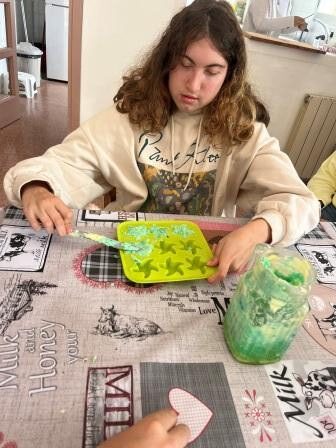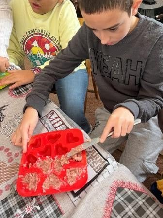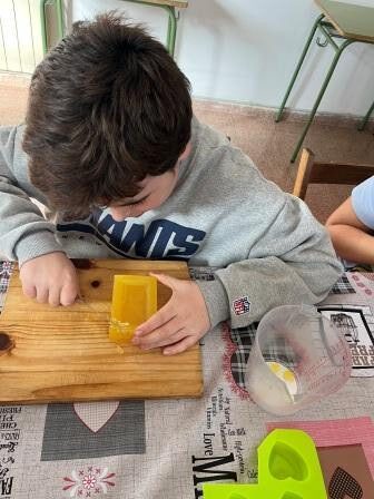 A L’AULA, HEM FET UN TALLER DE FER SABÓ ARTESANAL. VAM TALLAR SABÓ, ESCALFAR-HO AL MICROONES I LI VAM POSAR COLORANT. DESPRÉS HO VAM COL·LOCAR EN UNS MOTLLES AMB FORMES DE COR I D’ESTRELLA.