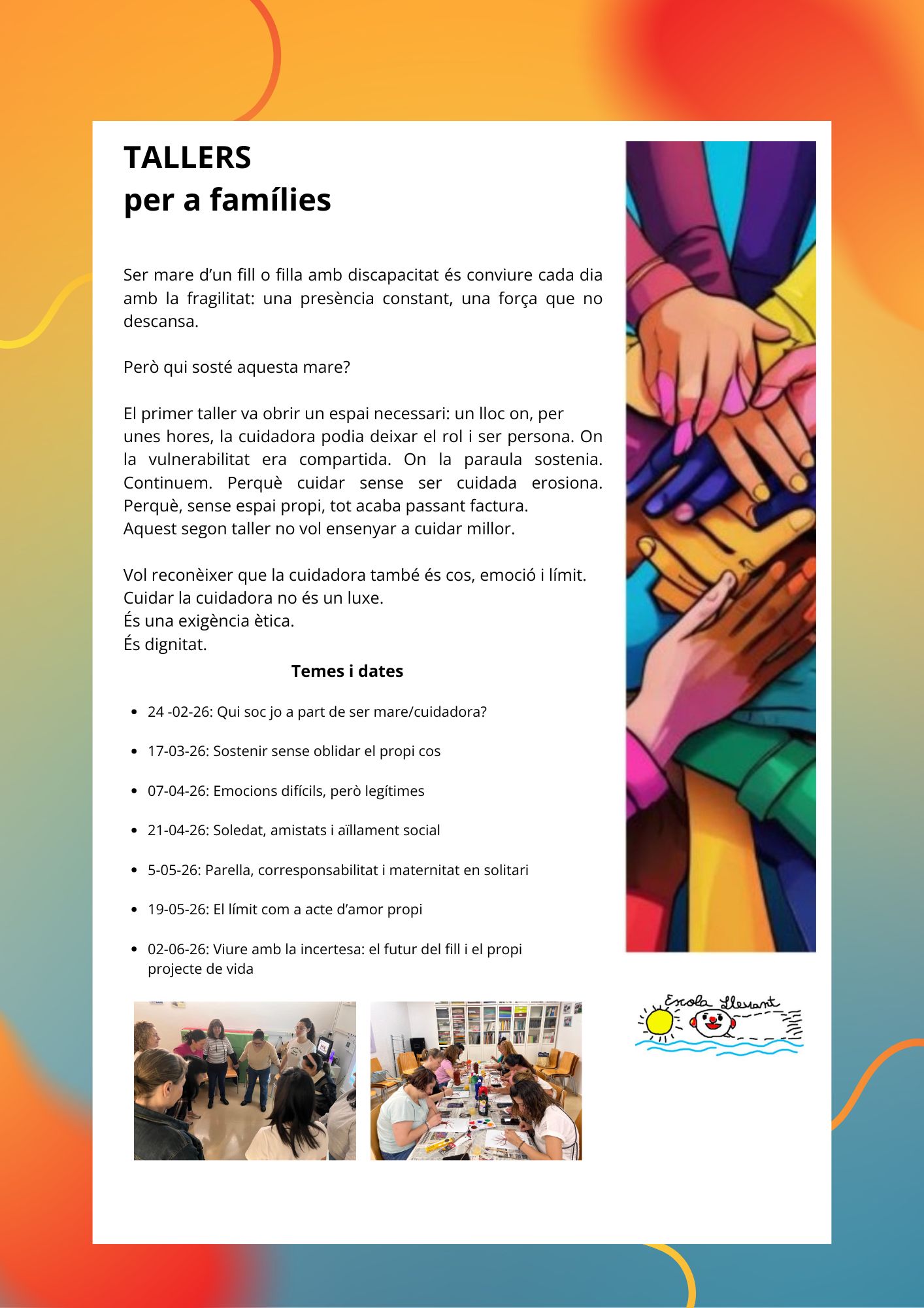 21/11/25Us fem arribar la informació d’una formació adreçada a famílies de persones amb diversitat funcional, que vol ser, sobretot, un espai de reflexió compartida i d’intercanvi d’experiències.