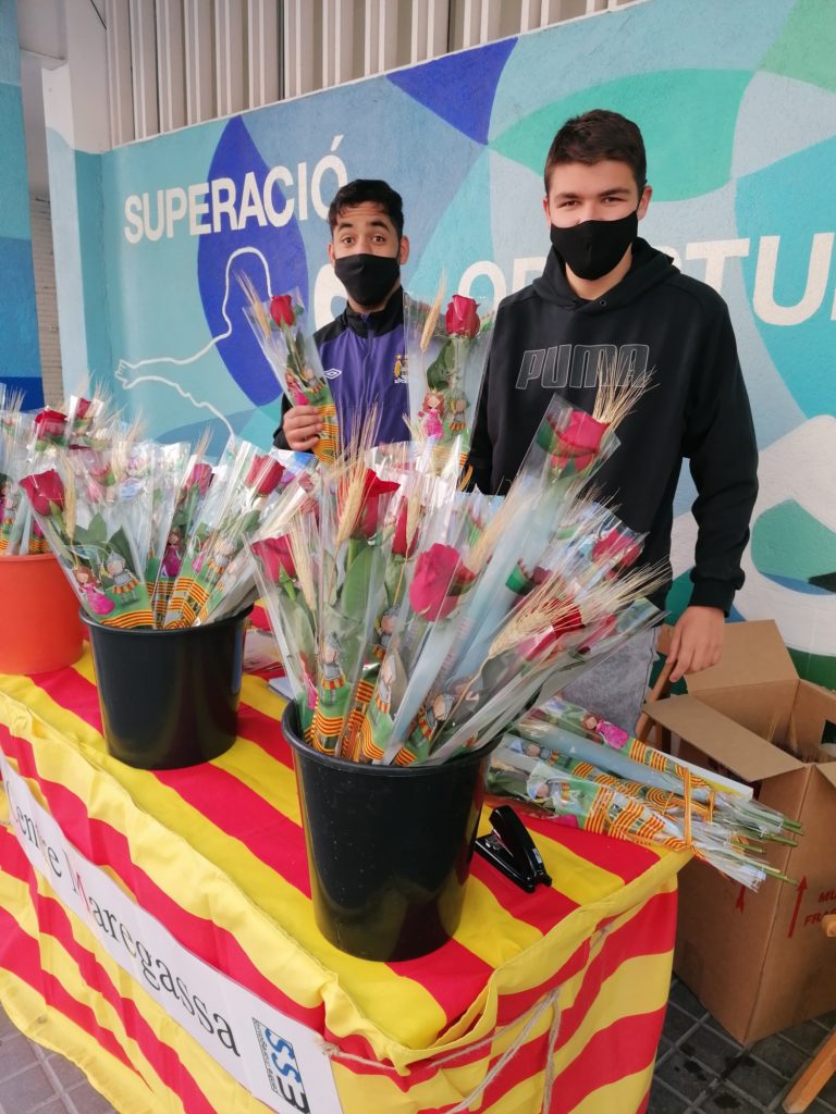 Aquest any, a conseqüència de la Covid, no podíem estar tots alhora a la parada, per tant ens vam organitzar per grups per realitzar diferents tasques. Mentre uns venien roses a la parada, uns altres van anar a portar els encàrrecs a Maregassa que havien fet els professors i alumnes del centre. La resta dels companys s’encarregaven de repartir les comandes pel centre de Badalona.