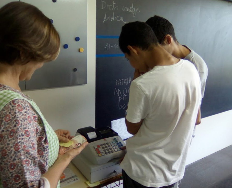 Treballem els euros, cobrant els menús de menjador, amb la caixa registradora.
