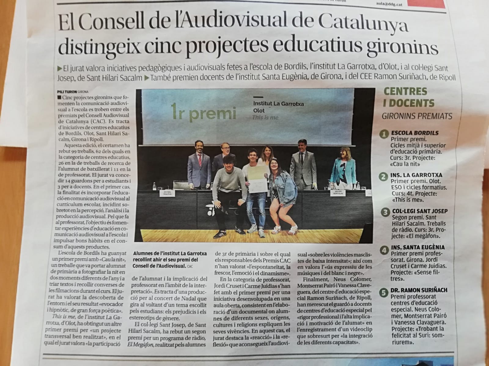 El passat dia 3 de juny vam anar a l’auditori del CosmoCaixa a l’acte de celebració d’entrega de premis de la darrera edició dels Premis CAC (Consell Audiovisual de Catalunya) a l’escola. El nostre treball “Trobant la felicitat al Suri: somriurem” va estar premiada dins la seva categoria per a professorat d’escoles d’educació especial, i reconeguda pel “rigor professional i l’alta implicació i motivació de l’alumnat” i per la “integració de les diferents capacitats” que es perceb en l’audiovisual. Ara que ja l’hem presentat a totes les famílies, el pengem perquè tothom que vulgui pugui visualitzar-lo.
