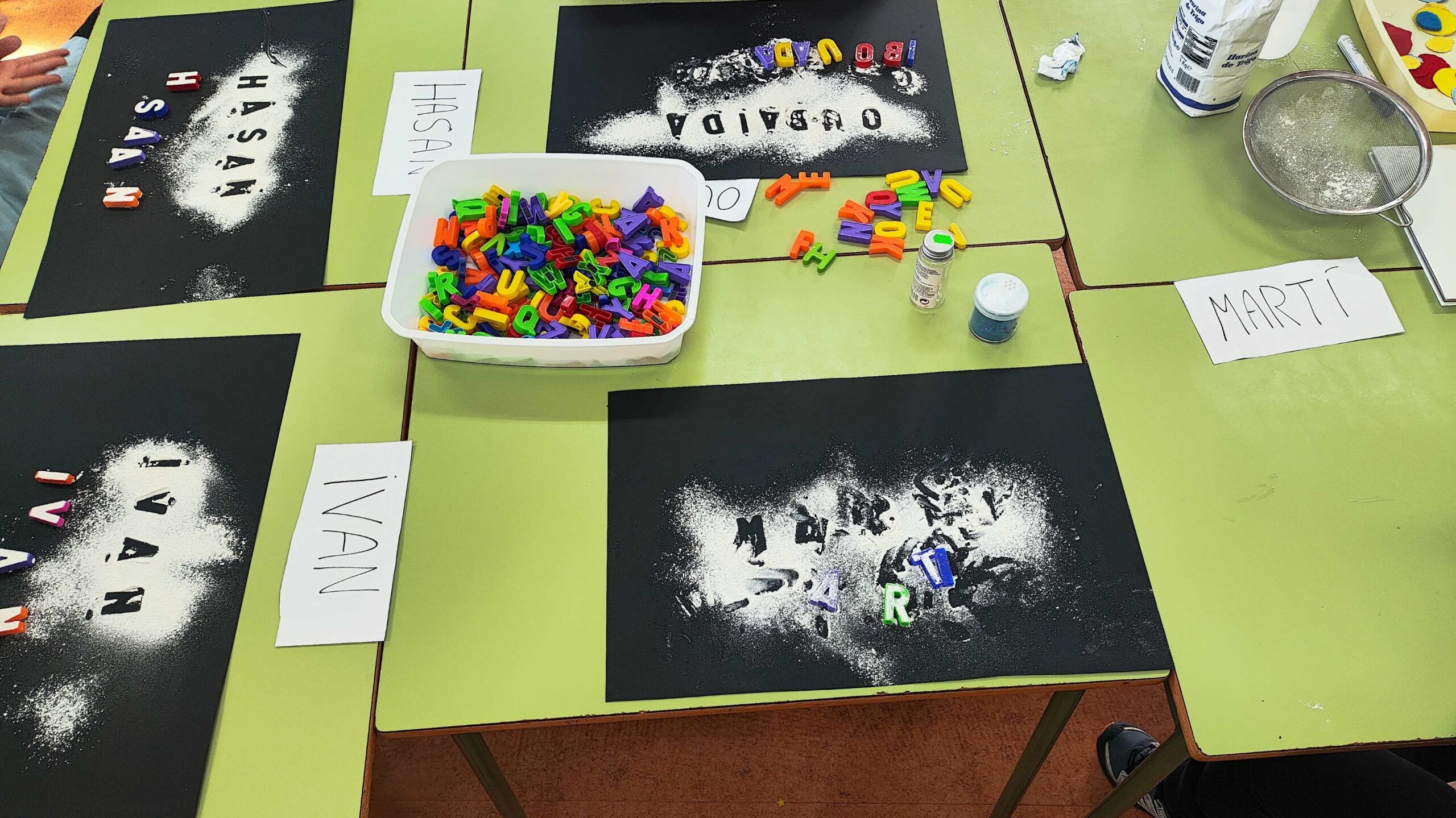 Fa uns dies, al grup 4 vam dur a terme una activitat amb el nom de cada alumne. Vam utilitzar cartolines negres, lletres magnètiques i farina. Primer vam haver de confeccionar el nostre nom correctament, després vam afegir farina amb el colador i finalment vam treure les lletres per veure el resultat. Mireu que vistós!!