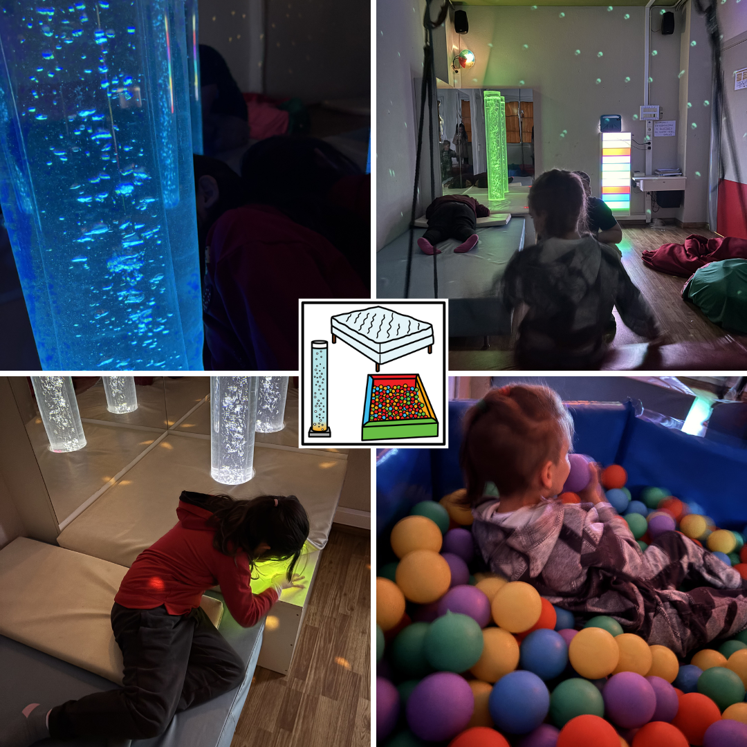 L’aula d’estimulació sensorial és un entorn tranquil i acollidor on la llum, els sons, les textures i els colors es converteixen en eines educatives. Mitjançant diferents materials i recursos —com columnes de bombolles, fibres òptiques, projectors de llum, música suau o materials tàctils— els alumnes poden experimentar sensacions que fomenten la relaxació, la curiositat i la comunicació.